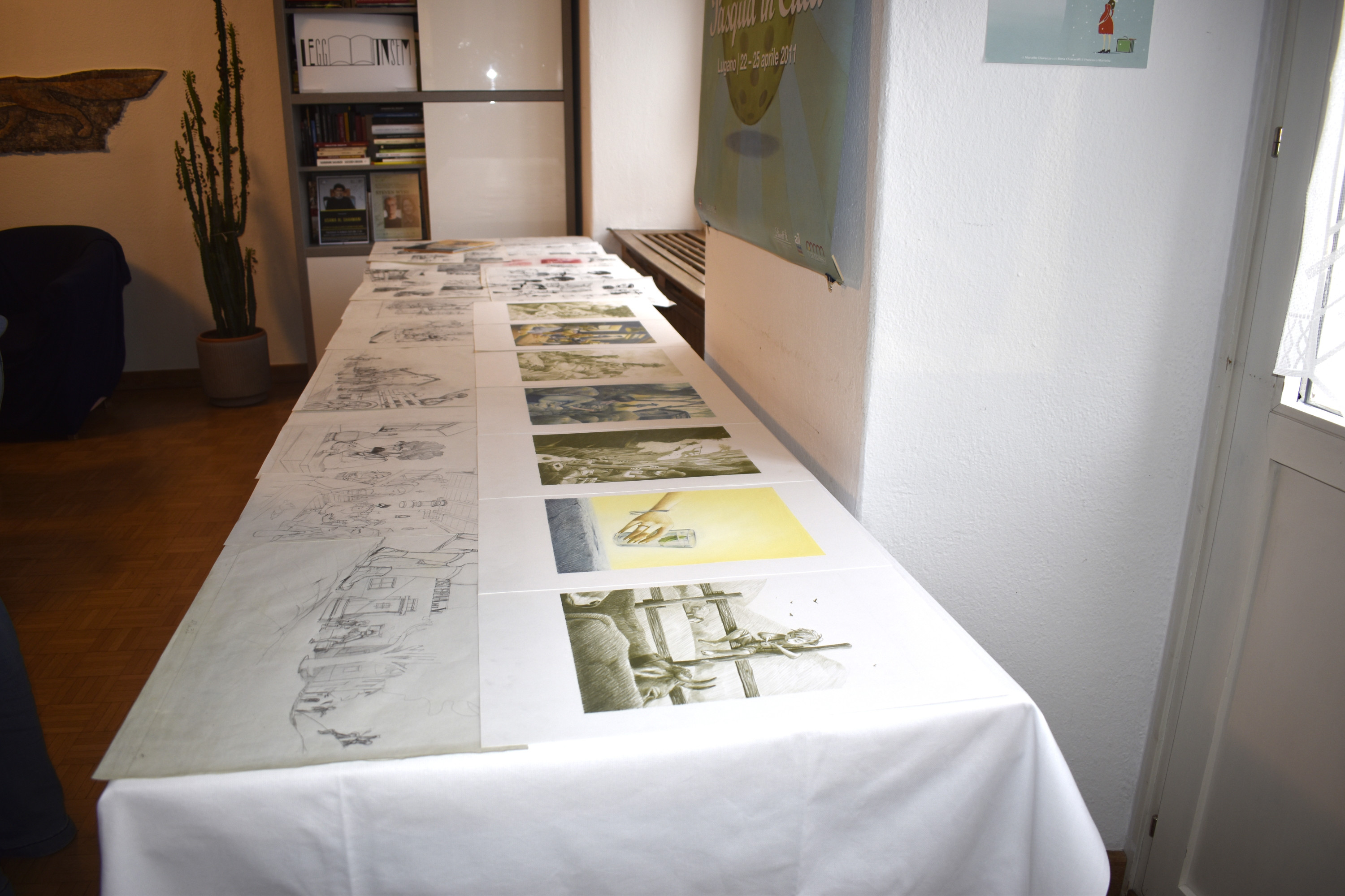 Un tavolo coperto da una tovaglia bianca, adagiato con disegni e illustrazioni di varie dimensioni, in un ambiente interno con una pianta e una finestra sullo sfondo.