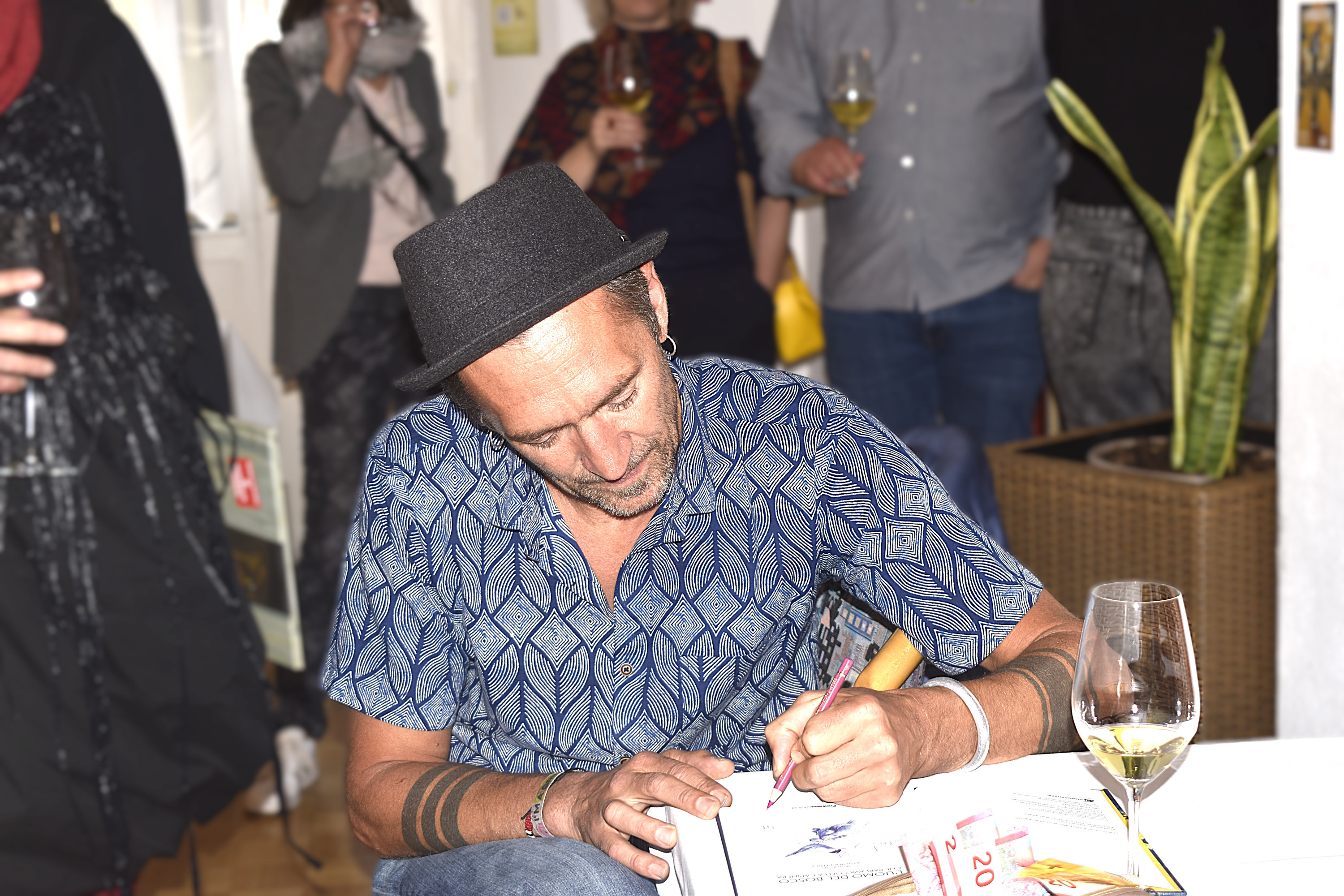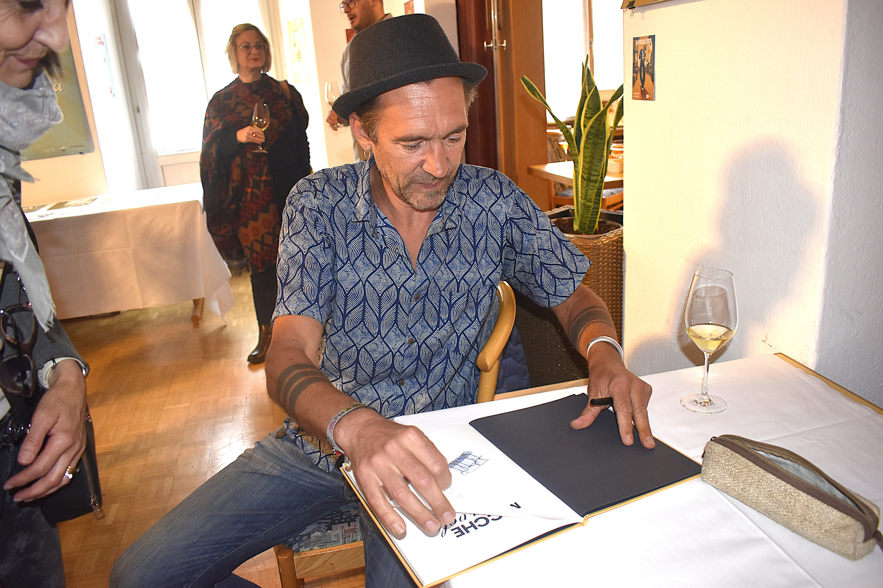 Un uomo con un cappello nero firma un libro, seduto a un tavolo. Una donna alle spalle di lui sorride, mentre altre persone osservano in un ambiente con opere d'arte appese alle pareti. Una pianta è visibile accanto a un bicchiere di vino bianco.