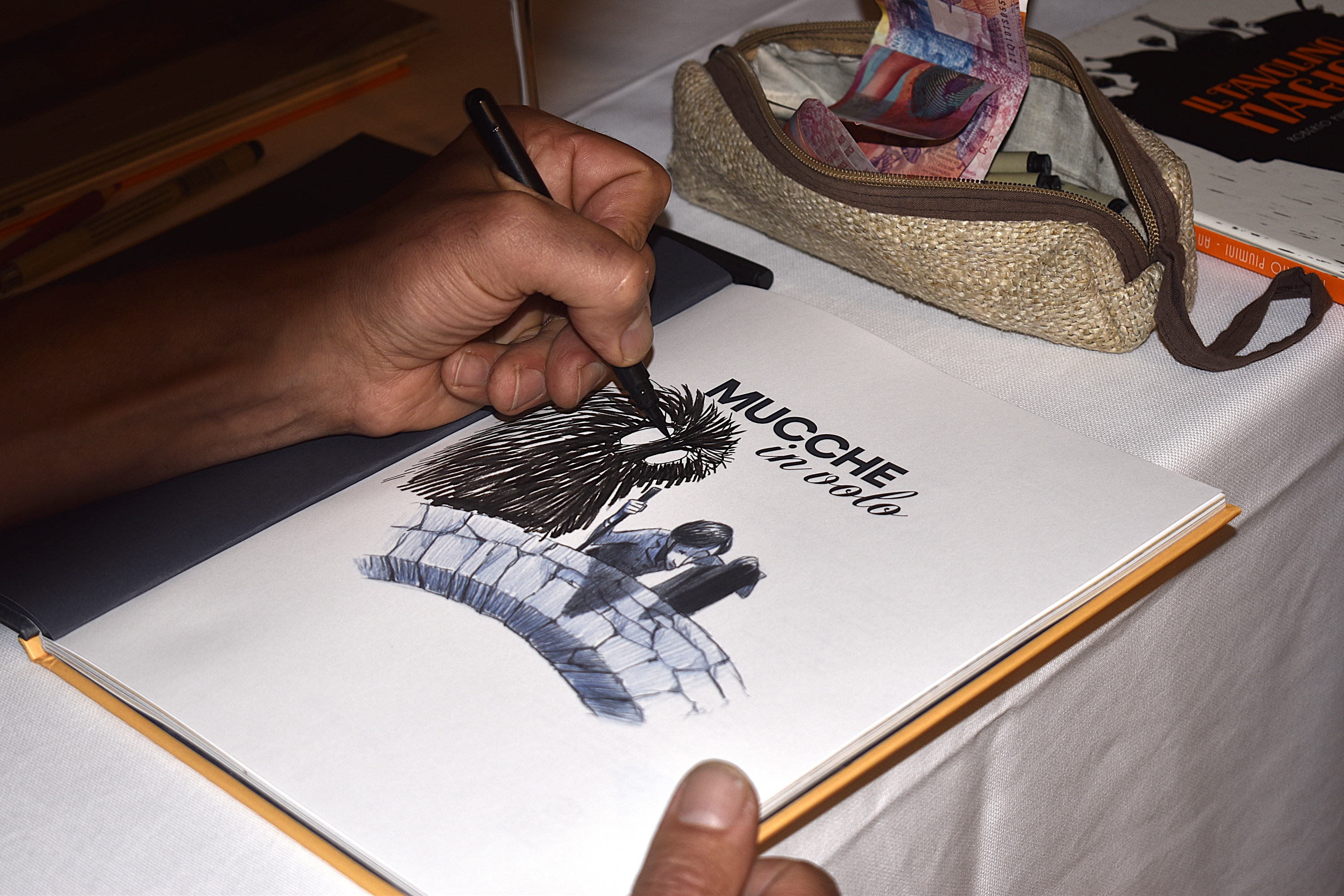 Una mano che disegna su una pagina di un libro aperto. Il disegno rappresenta una figura stilizzata con spine e il titolo "Mucche in volo" scritto sopra. Accanto, c'è una borsa di stoffa e un altro libro.