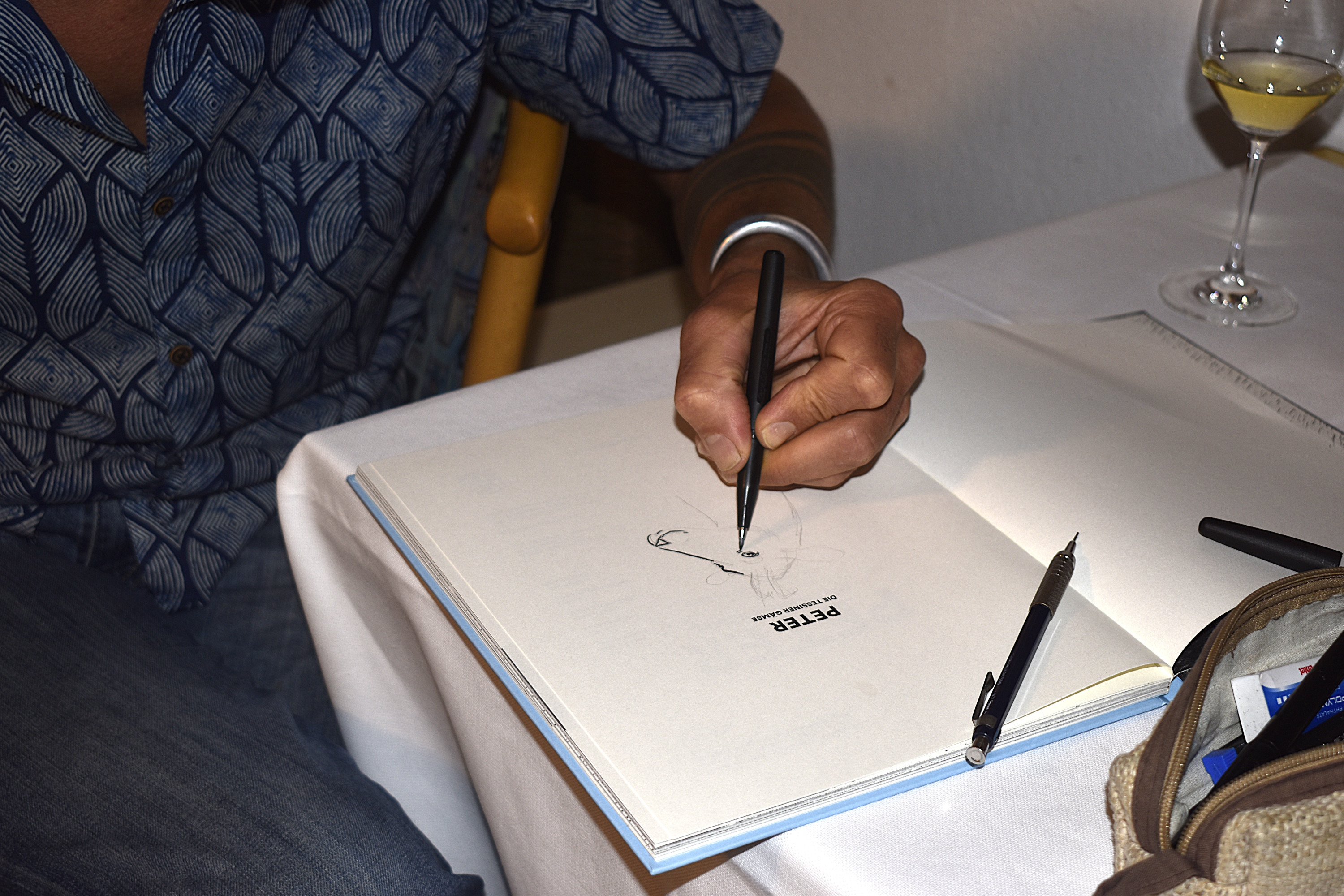 Una mano disegna su un foglio aperto con una penna, mentre un bicchiere di vino è appoggiato su un tavolo. Sul foglio si legge il nome "PETER".