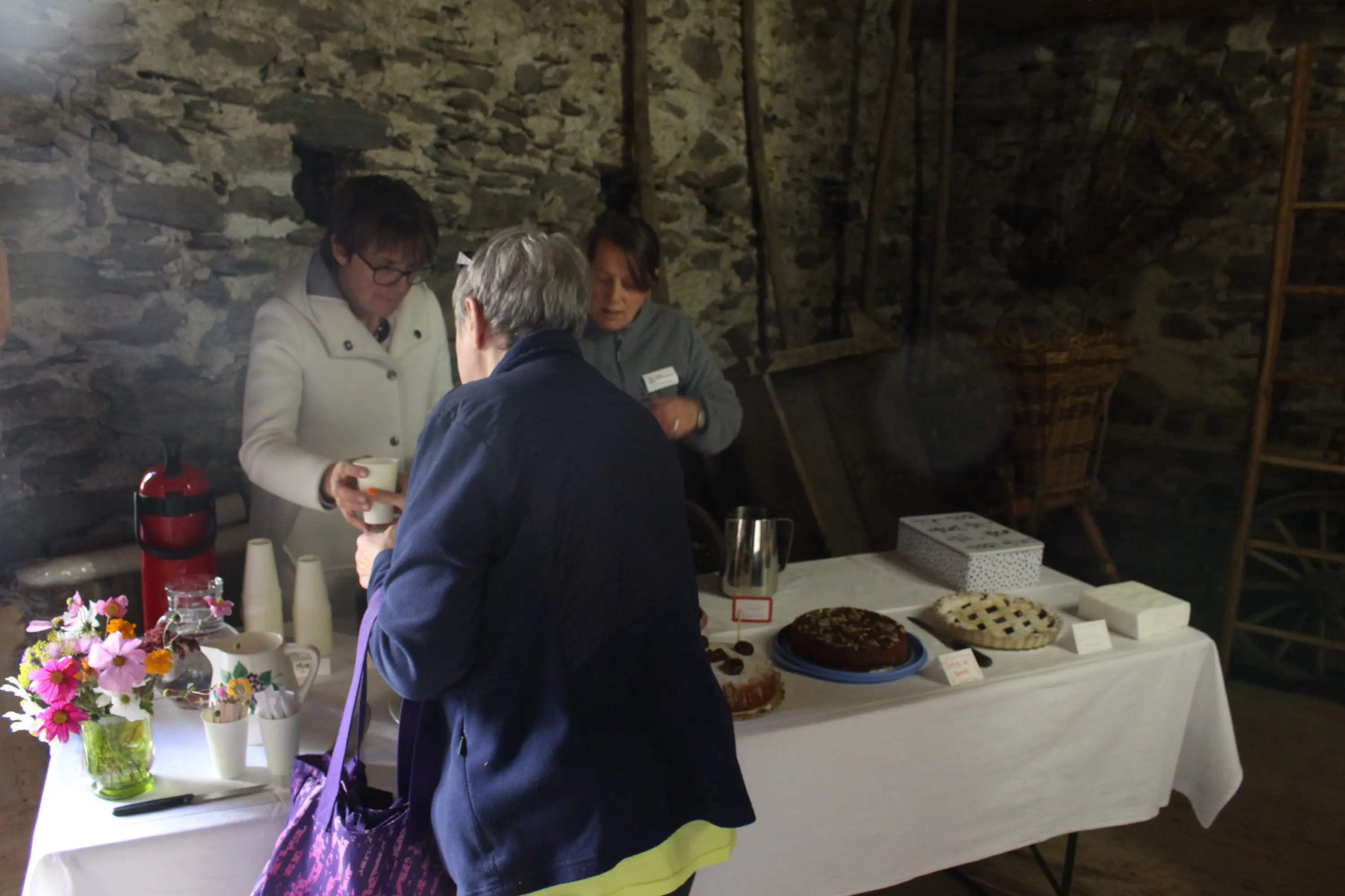 Tre donne di diverse età si trovano attorno a un tavolo mentre piantano dei semi in un vassoio per semenzaio. Due donne indossano guanti blu e sono concentrate sull'attività, mentre una terza osserva attentamente. Sul tavolo ci sono
