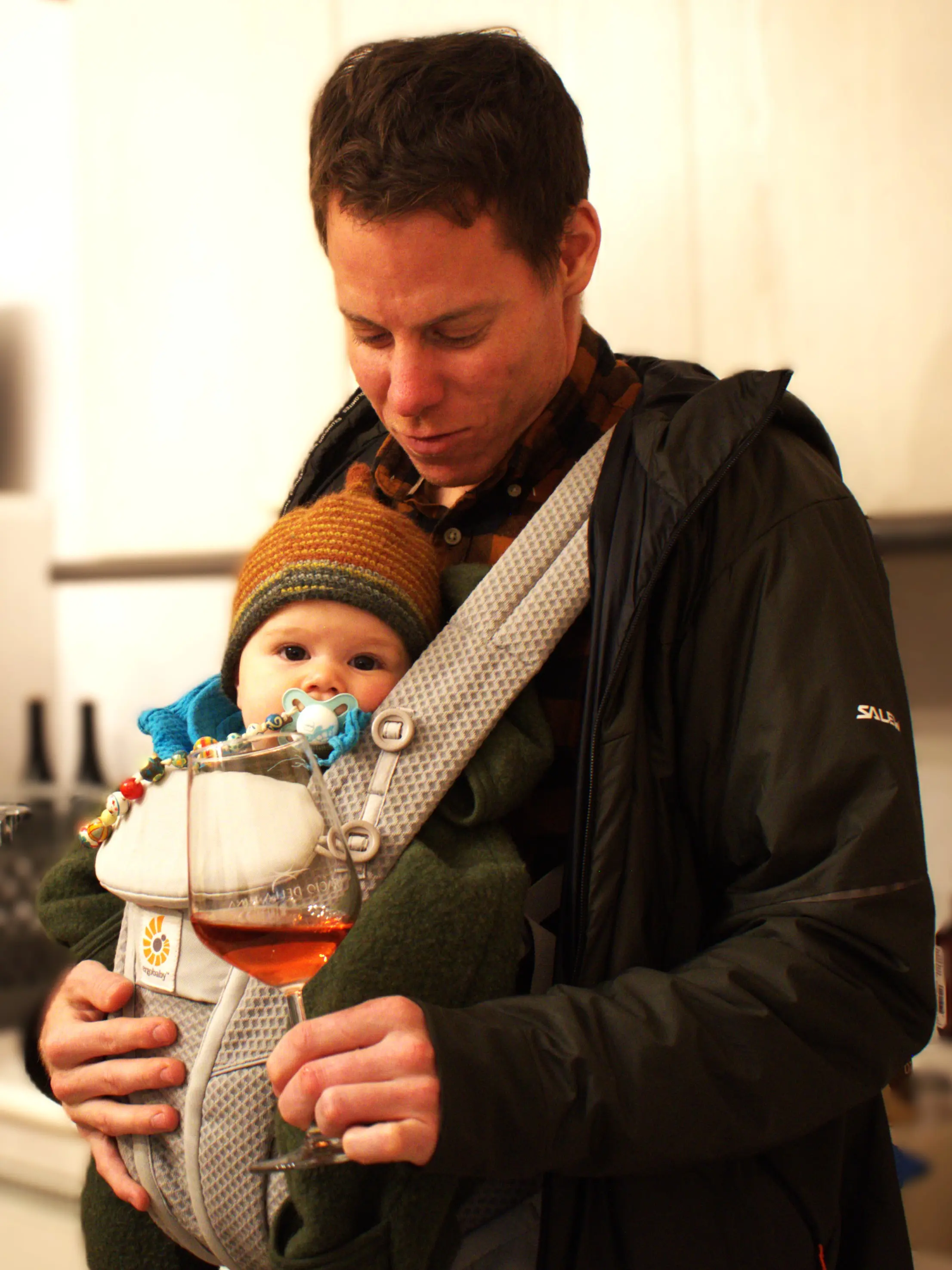 Un uomo sorridente con occhiali e una giacca nera, insieme a un bambino in un giubbotto verde scuro e cappello, si trovano in una stanza con pare