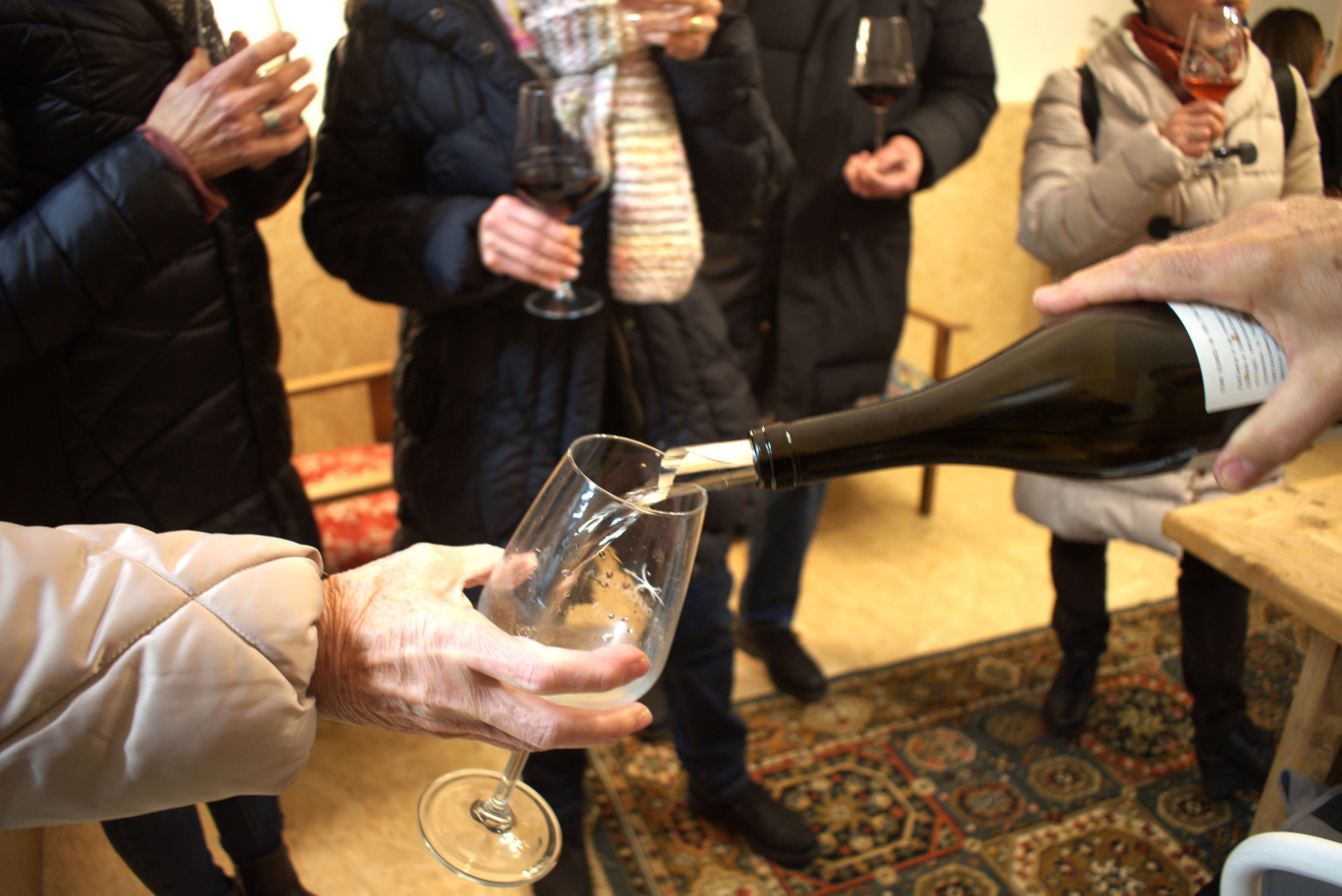 Un gruppo di donne, vestite con giacconi e sciarpe, ascolta attentamente in una cantina. Sullo sfondo si vedono botti di legno.