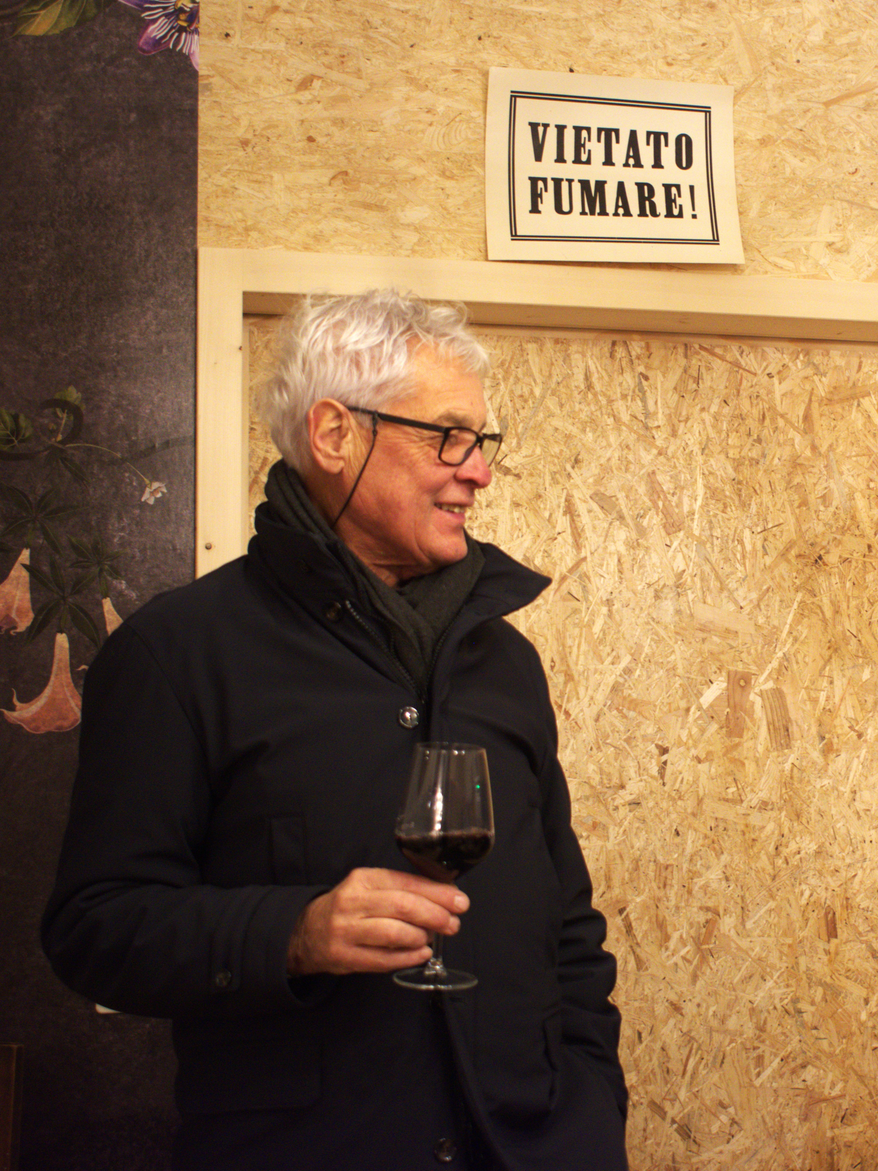 Uomo con capelli grigi e occhiali, in piedi mentre tiene un bicchiere di vino rosso. Sullo sfondo è visibile un cartello che dice "VIETATO