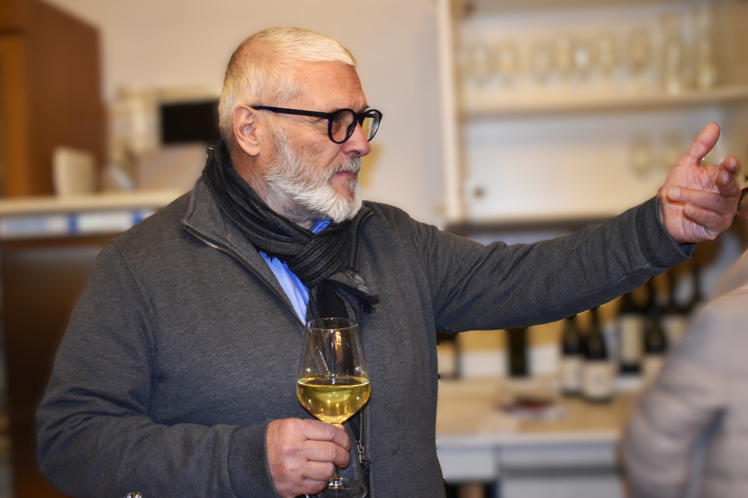 Uomo anziano con occhiali e barba grigia, che indossa un maglione e una sciarpa nera. Tiene un bicchiere di vino bianco mentre parla gest