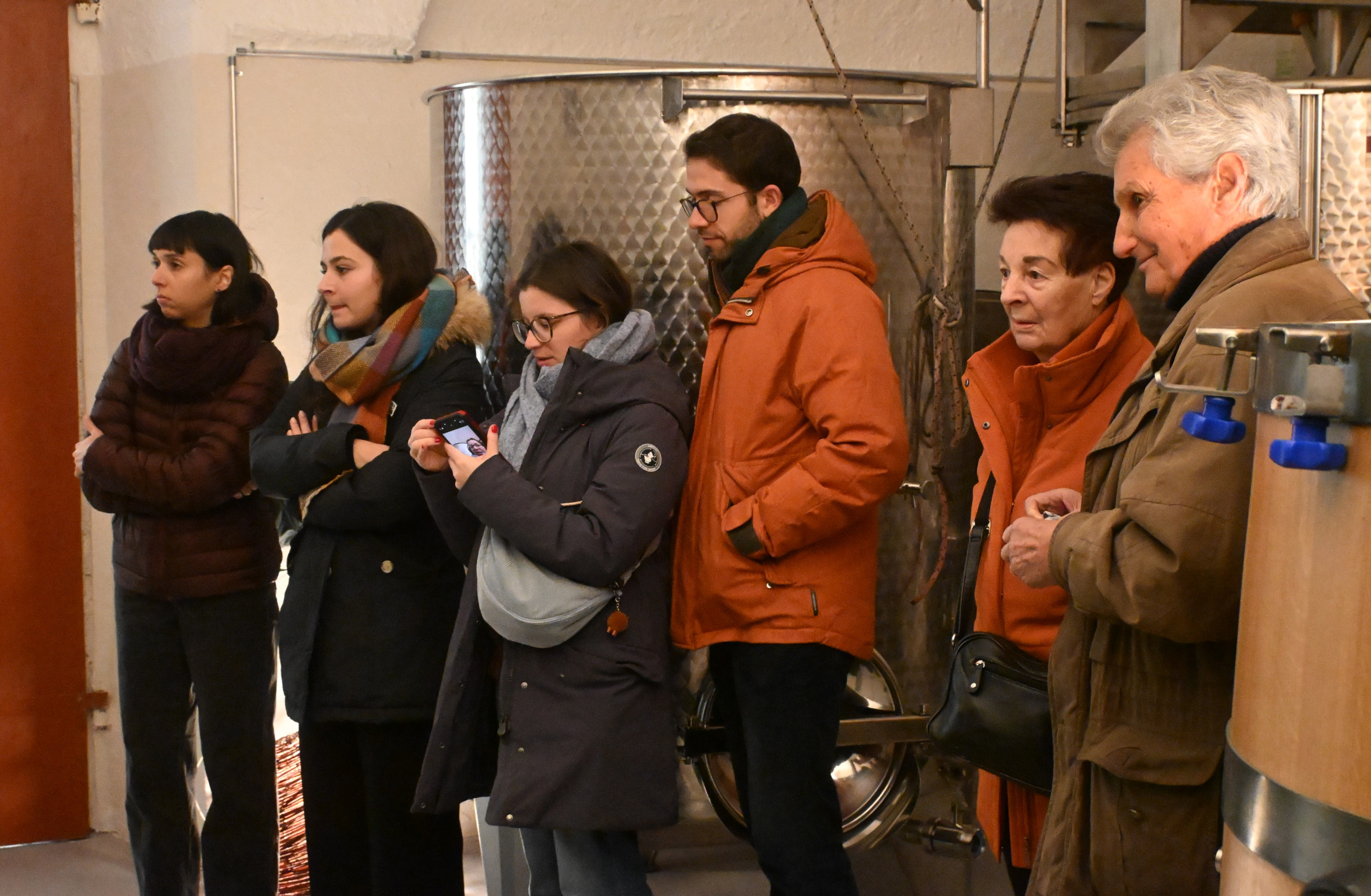 Gruppo di sei persone in una cantina. Alcuni guardano con attenzione, altri controllano i telefoni. Tutti indossano abbigliamento invernale.