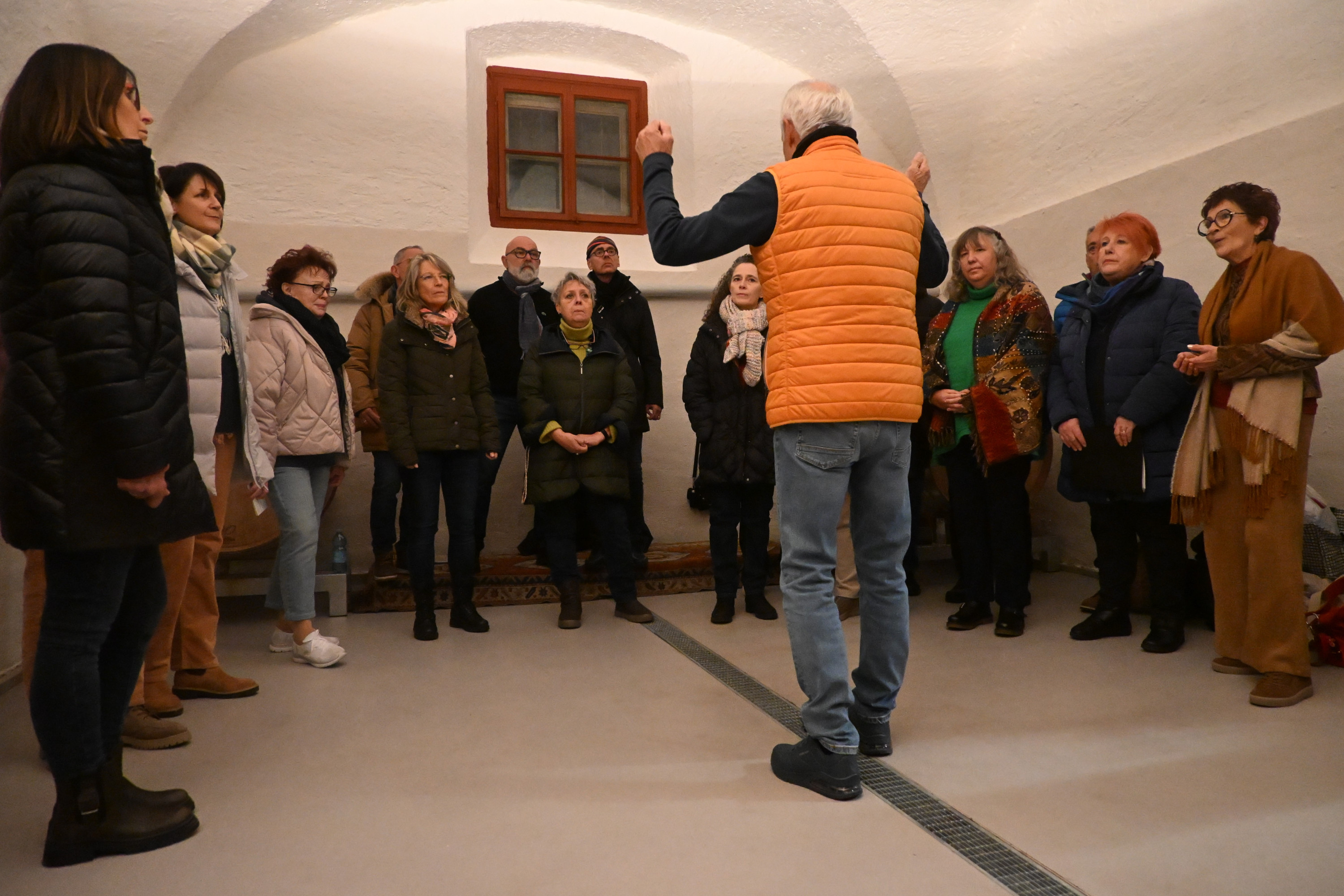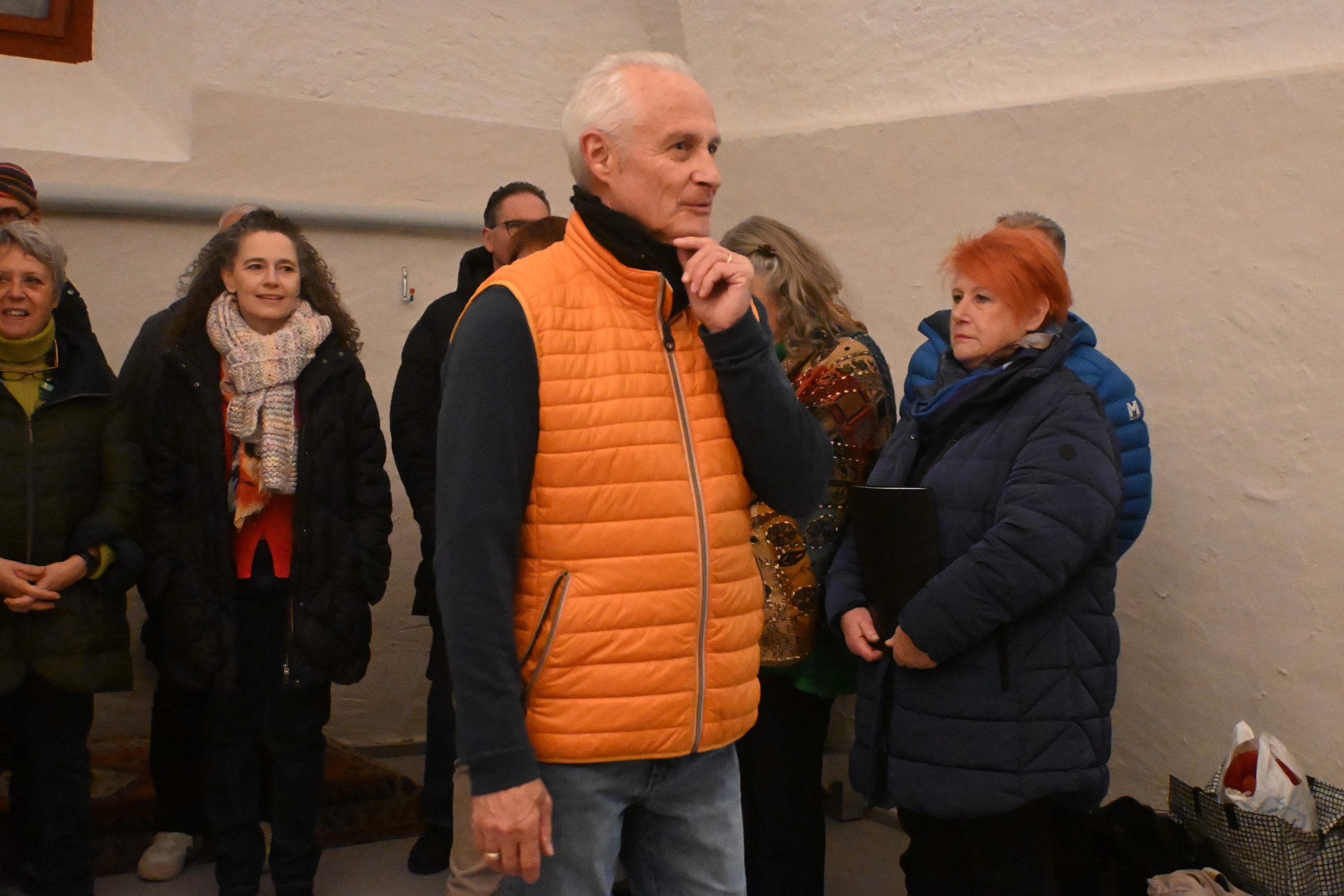 Un gruppo di persone si trova in una stanza con pareti bianche e un soffitto a volta. Un uomo in giacca arancione sta parlando, mentre gli altri, in ab