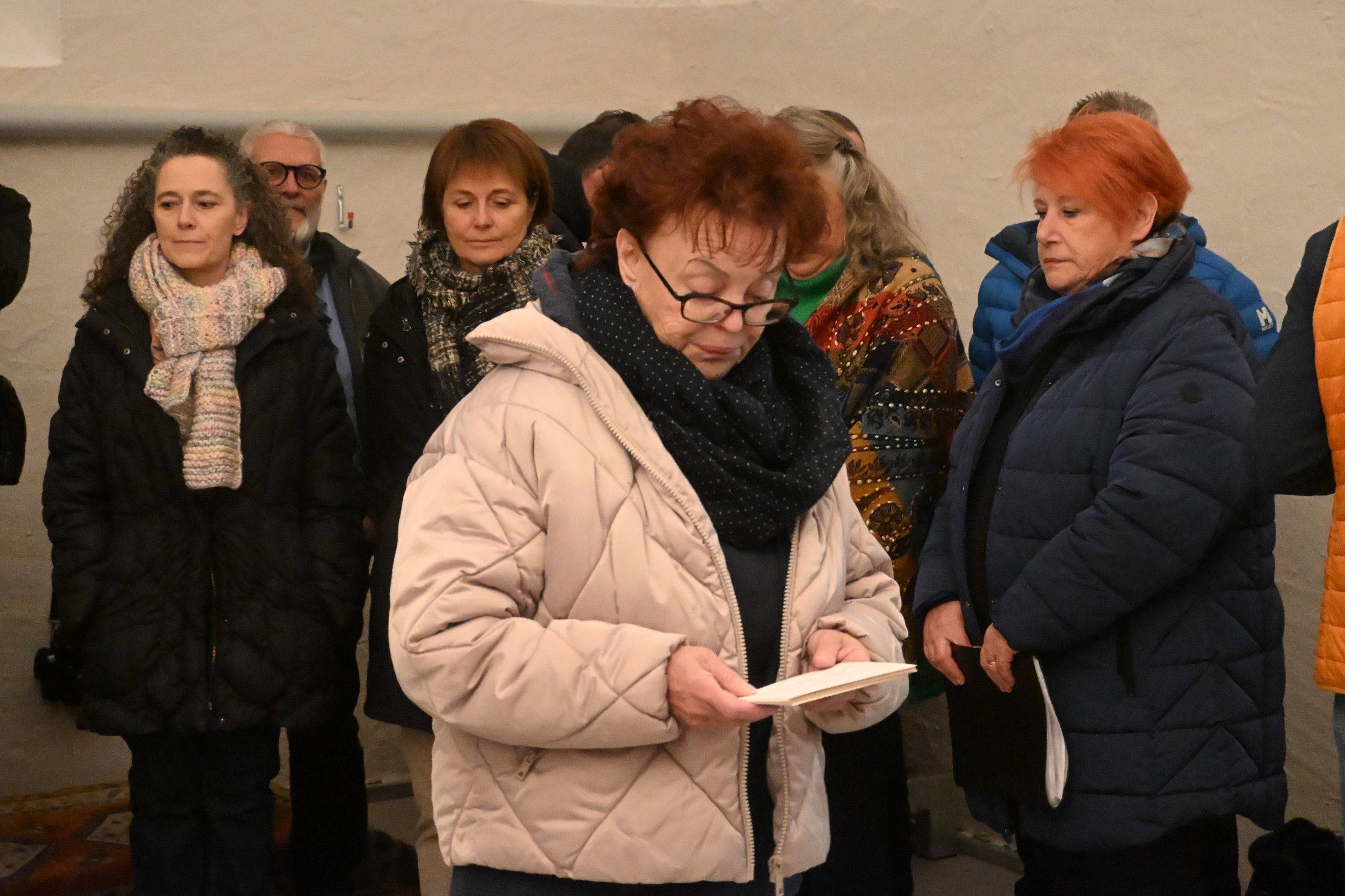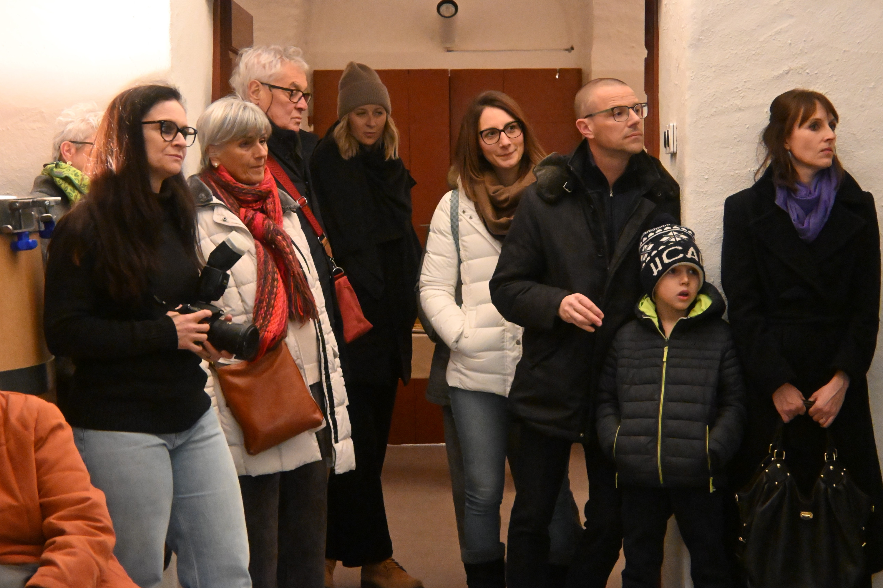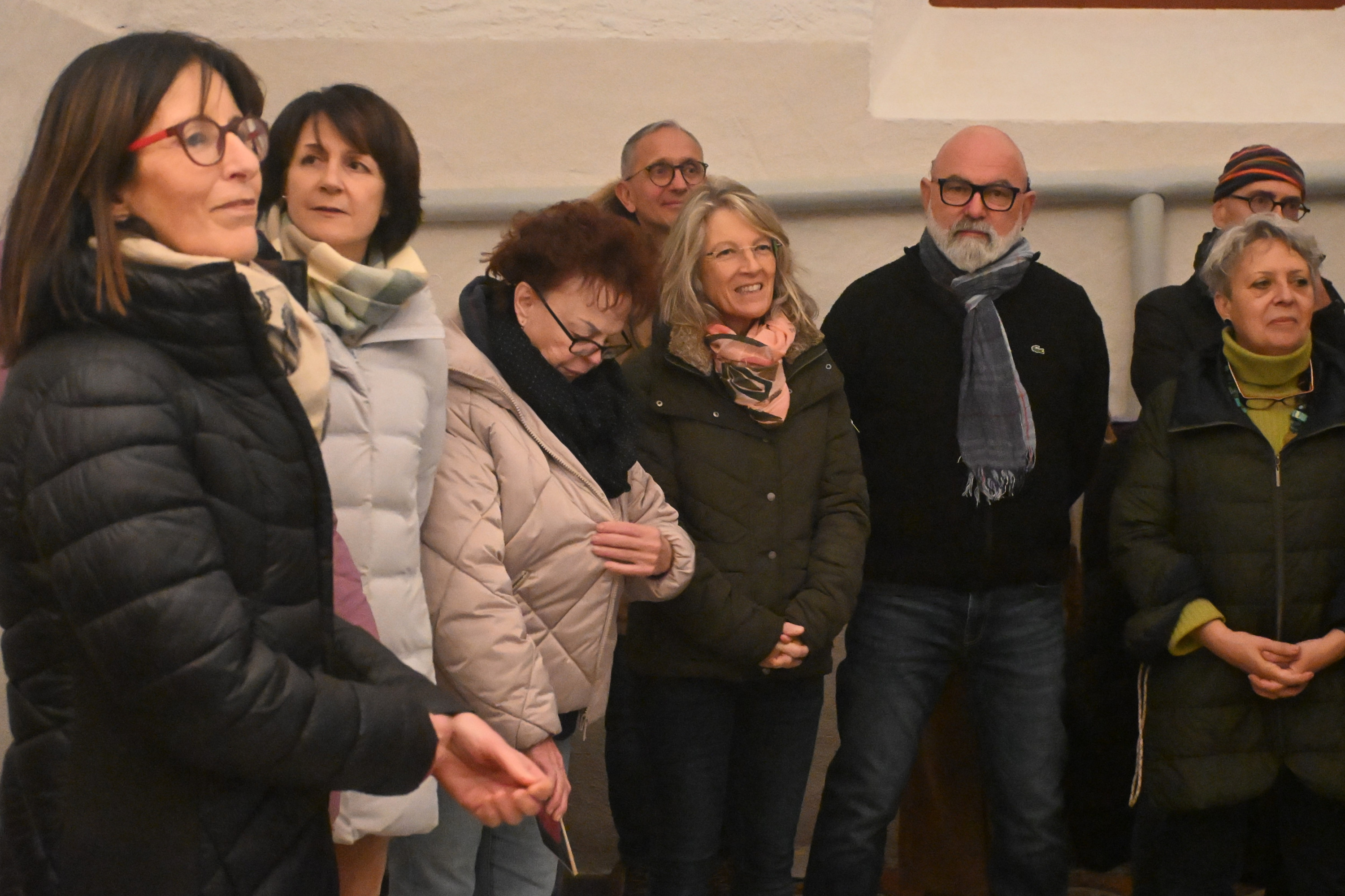 Gruppo di persone in piedi, sorridenti e ascoltando attentamente, in un ambiente interno. Le donne indossano sciarpe e giacche, mentre gli uomini hanno occh