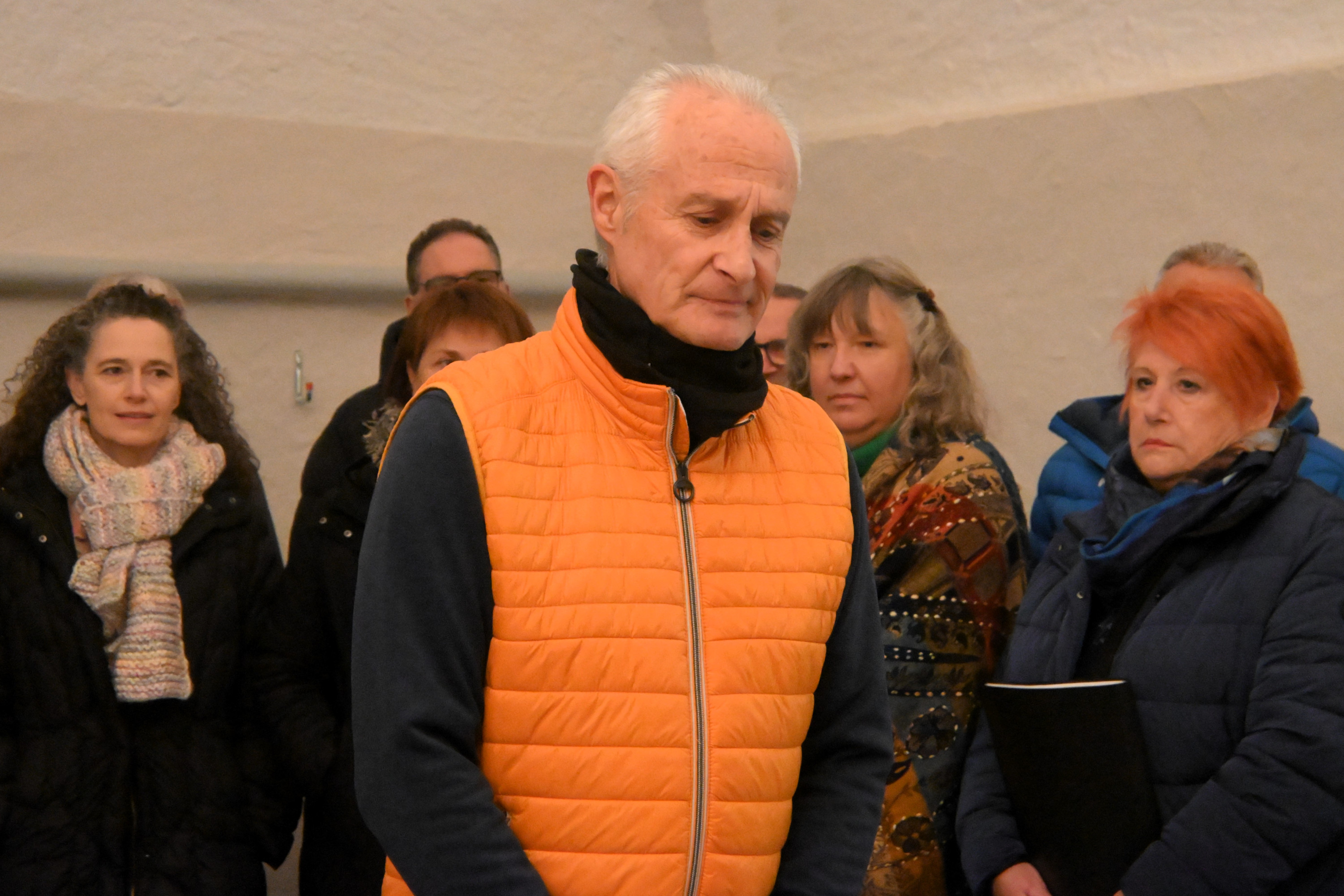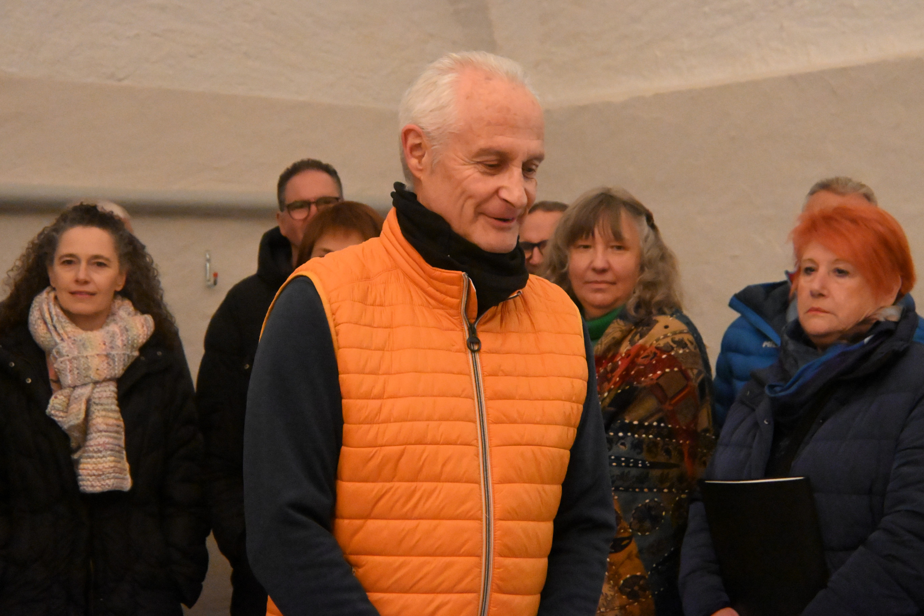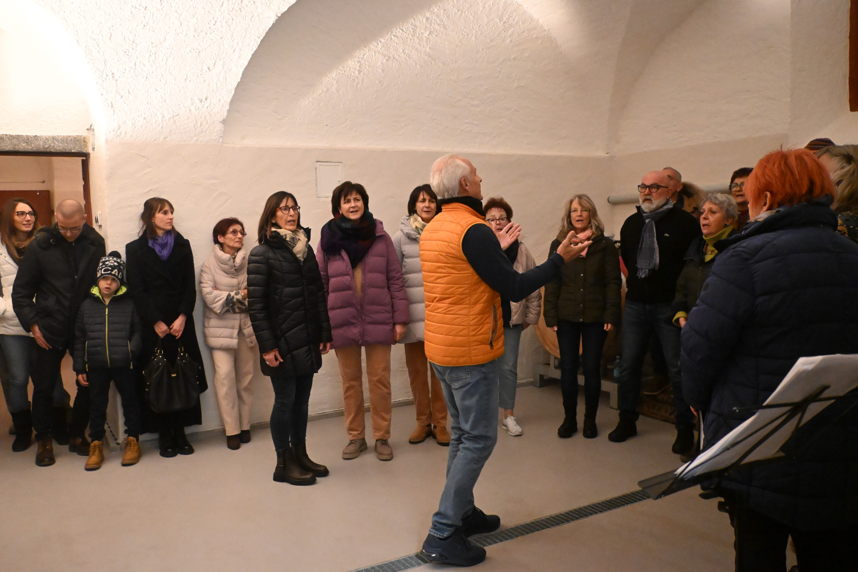 Un gruppo di persone, vestite in giacche invernali, canta insieme in una sala. Un uomo con un gilet arancione si trova di fronte al gruppo, guidando l