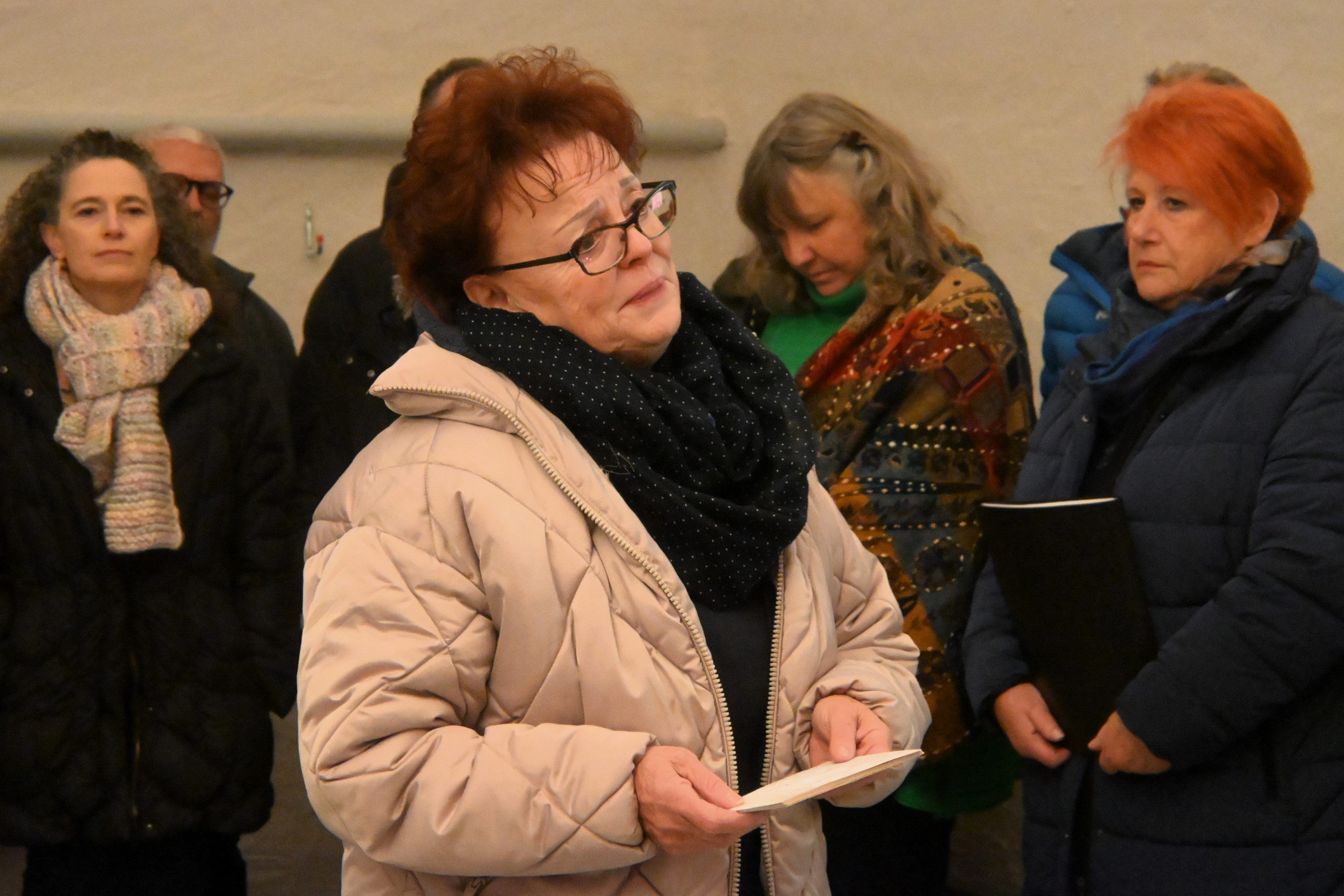 Un gruppo di persone canta in una stanza, accompagnato da un uomo che dirige. Gli adulti indossano giacche e cappotti invernali e sembrano concentrati mentre partecipano