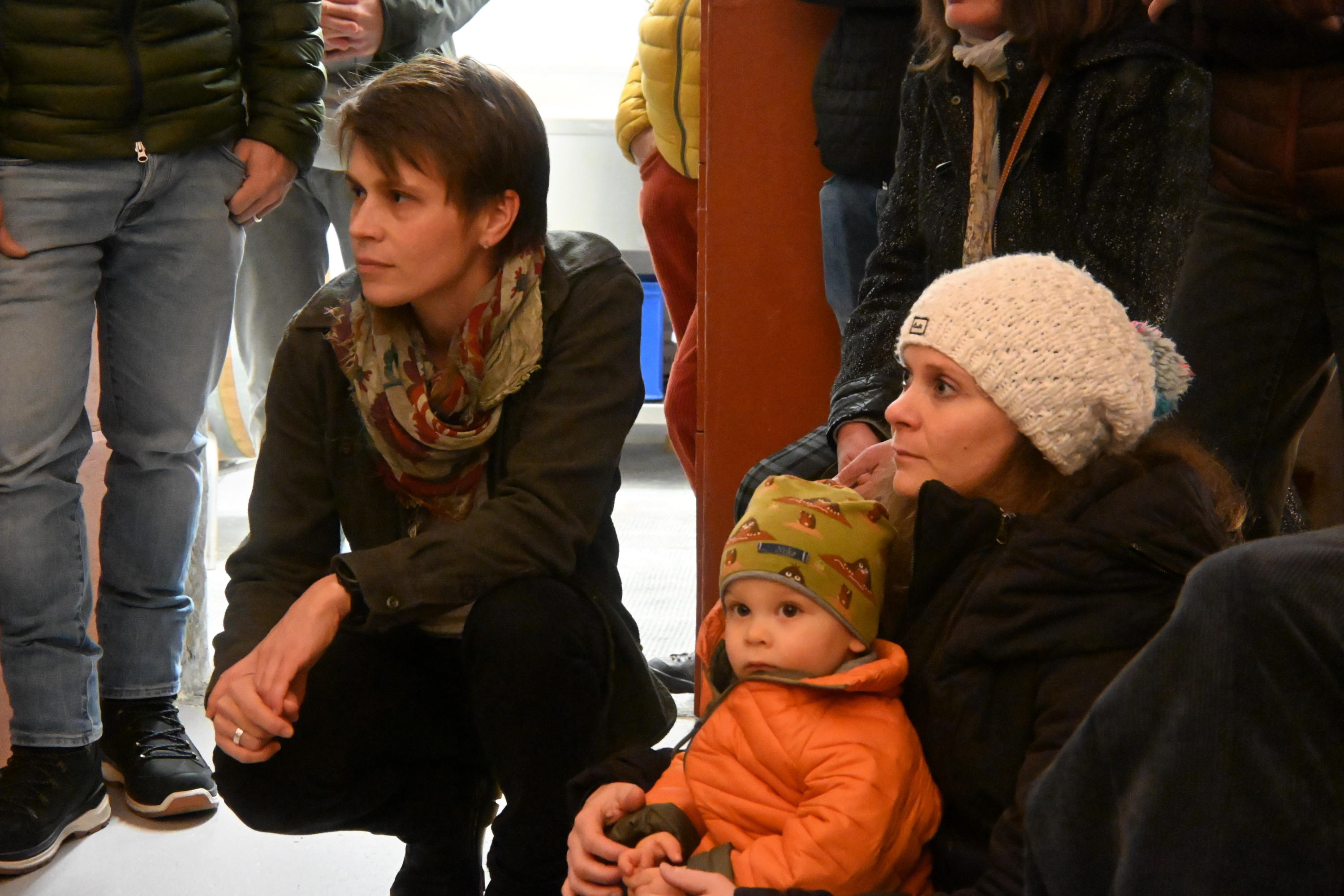 Un gruppo di persone in un ambiente interno, alcune con giacche bianche e sciarpe. Alcuni adulti stanno osservando, mentre un bambino è al centro del gruppo. L