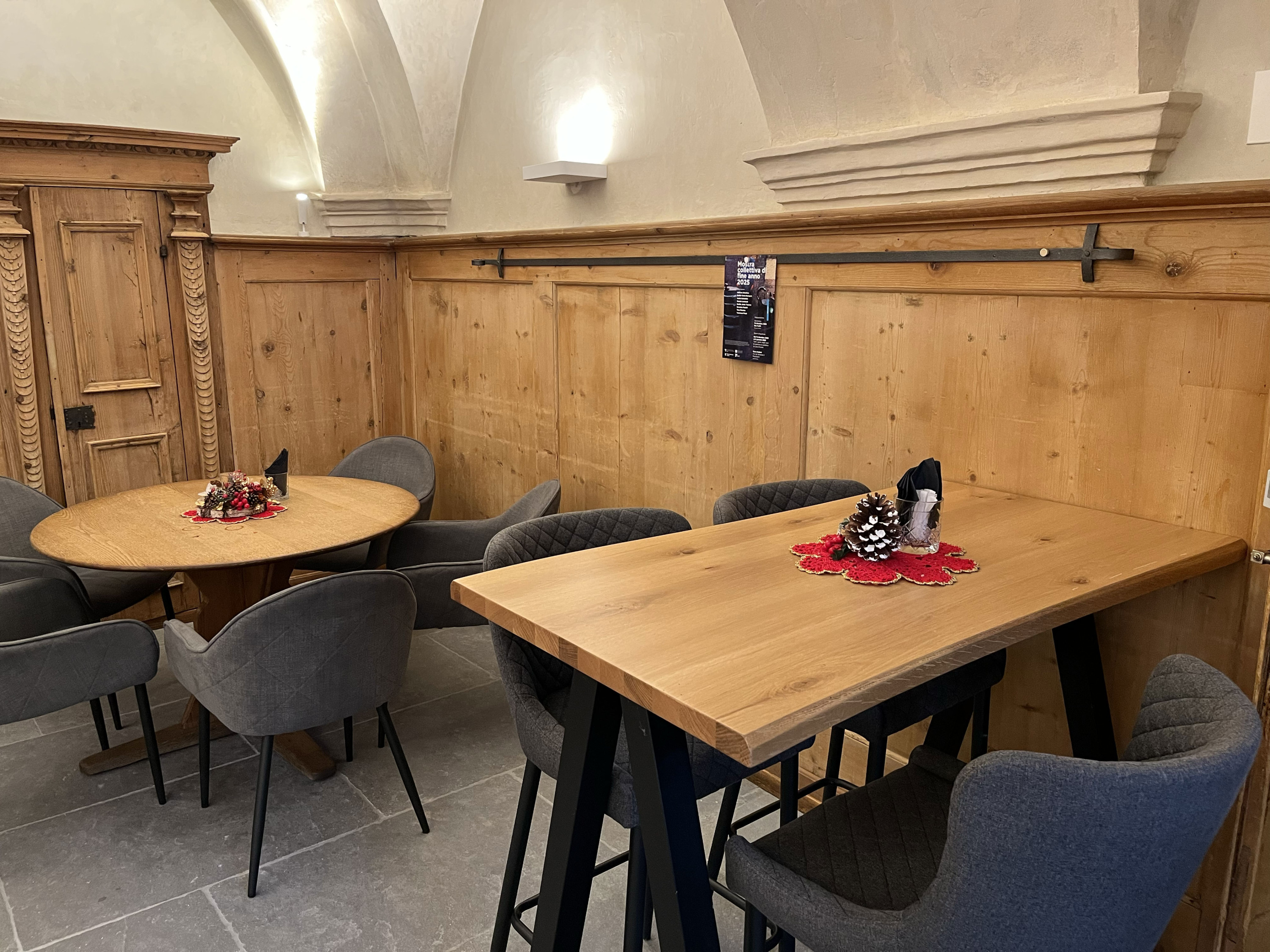Interno di un ristorante con tavoli in legno chiaro e sedie grigie. Decorazioni natalizie su uno dei tavoli. Muri in pietra e legno chi