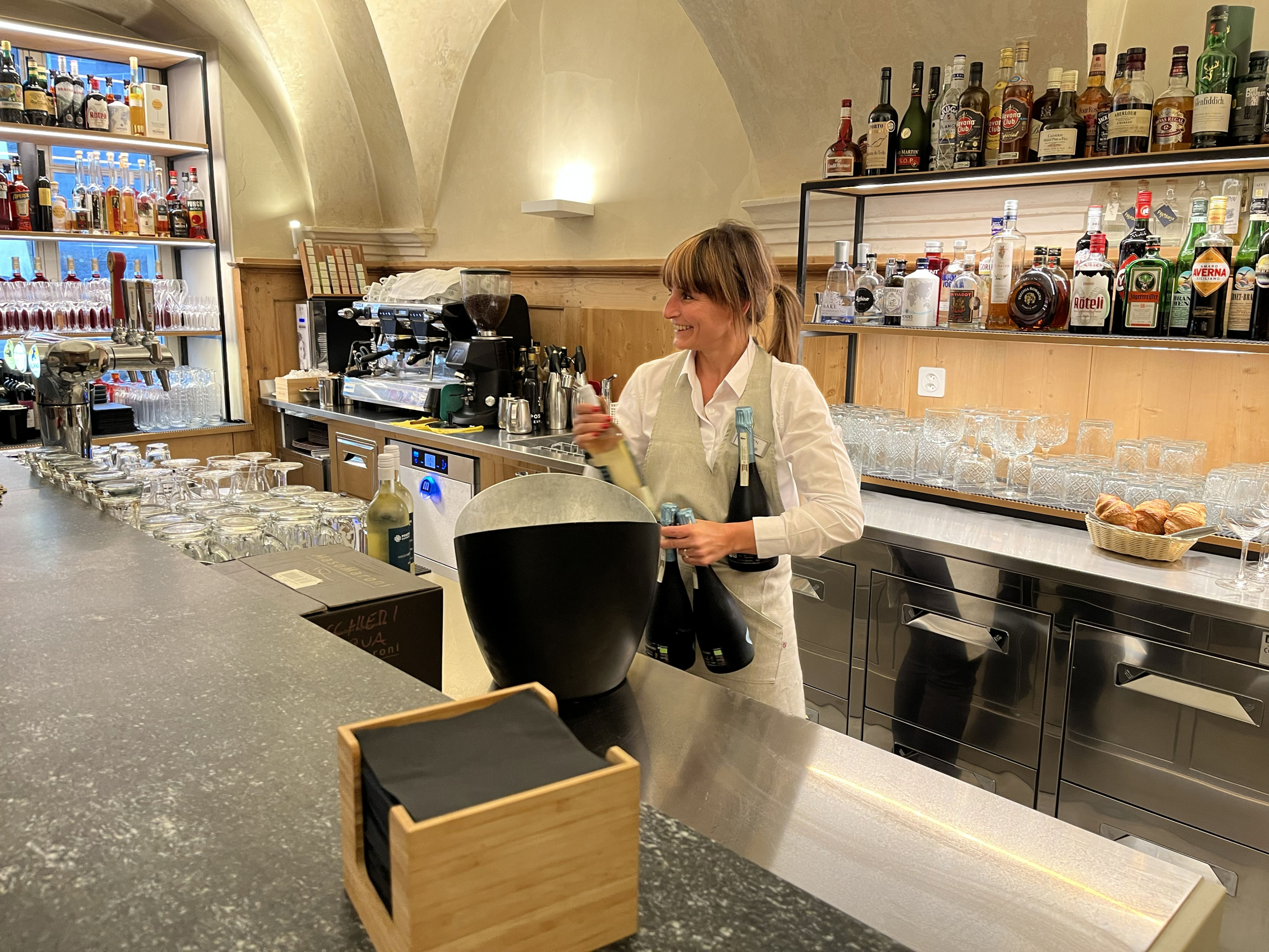 Una barista in camicia bianca apre una bottiglia di champagne al bancone di un bar elegante. Sullo sfondo si vedono bottiglie di alcolici e bicchieri di
