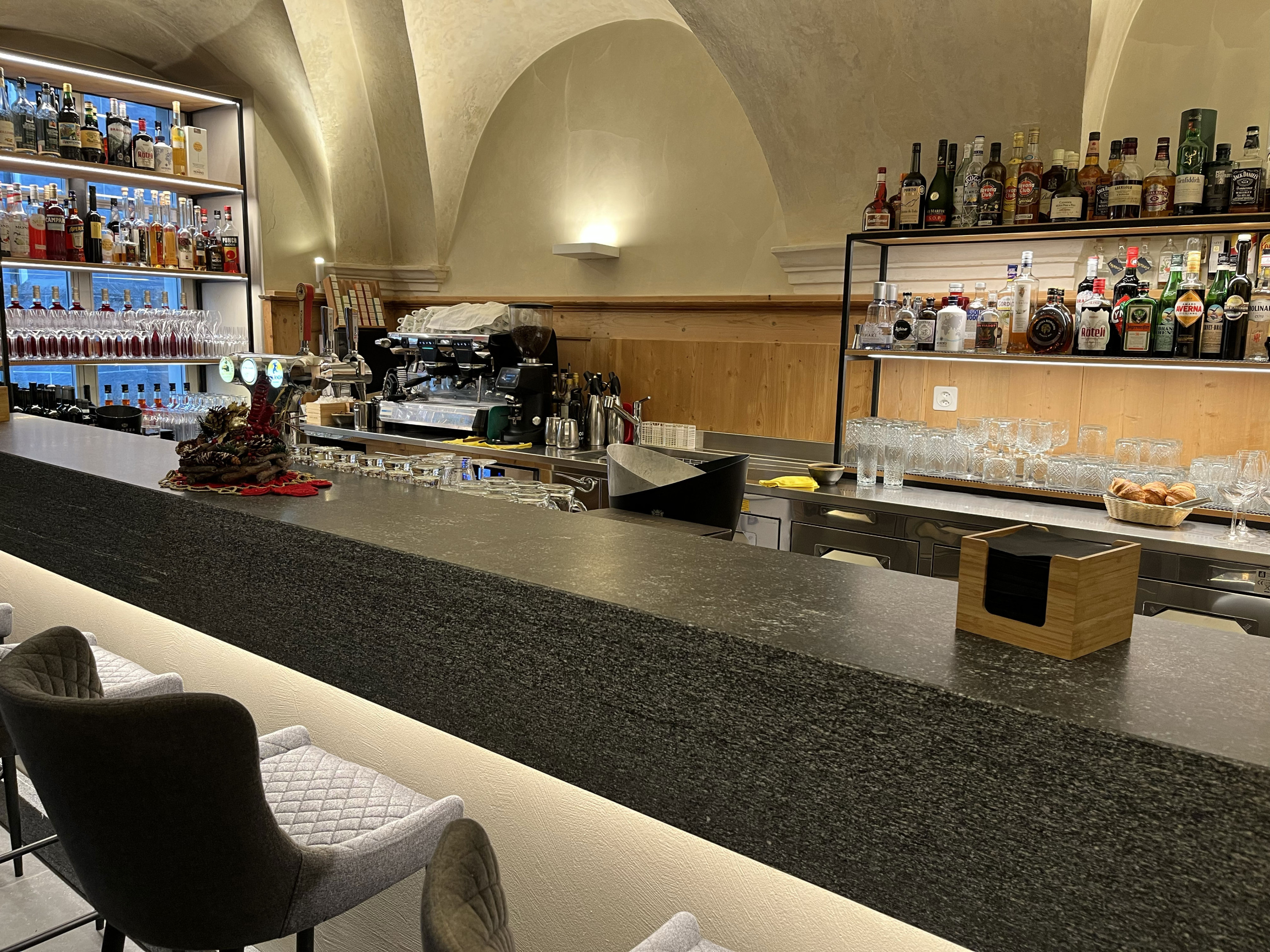Bar elegante con un bancone in pietra scura, macchine da caffè e una selezione di alcolici. Dietro il bar, scaffali con bottiglie di liquori