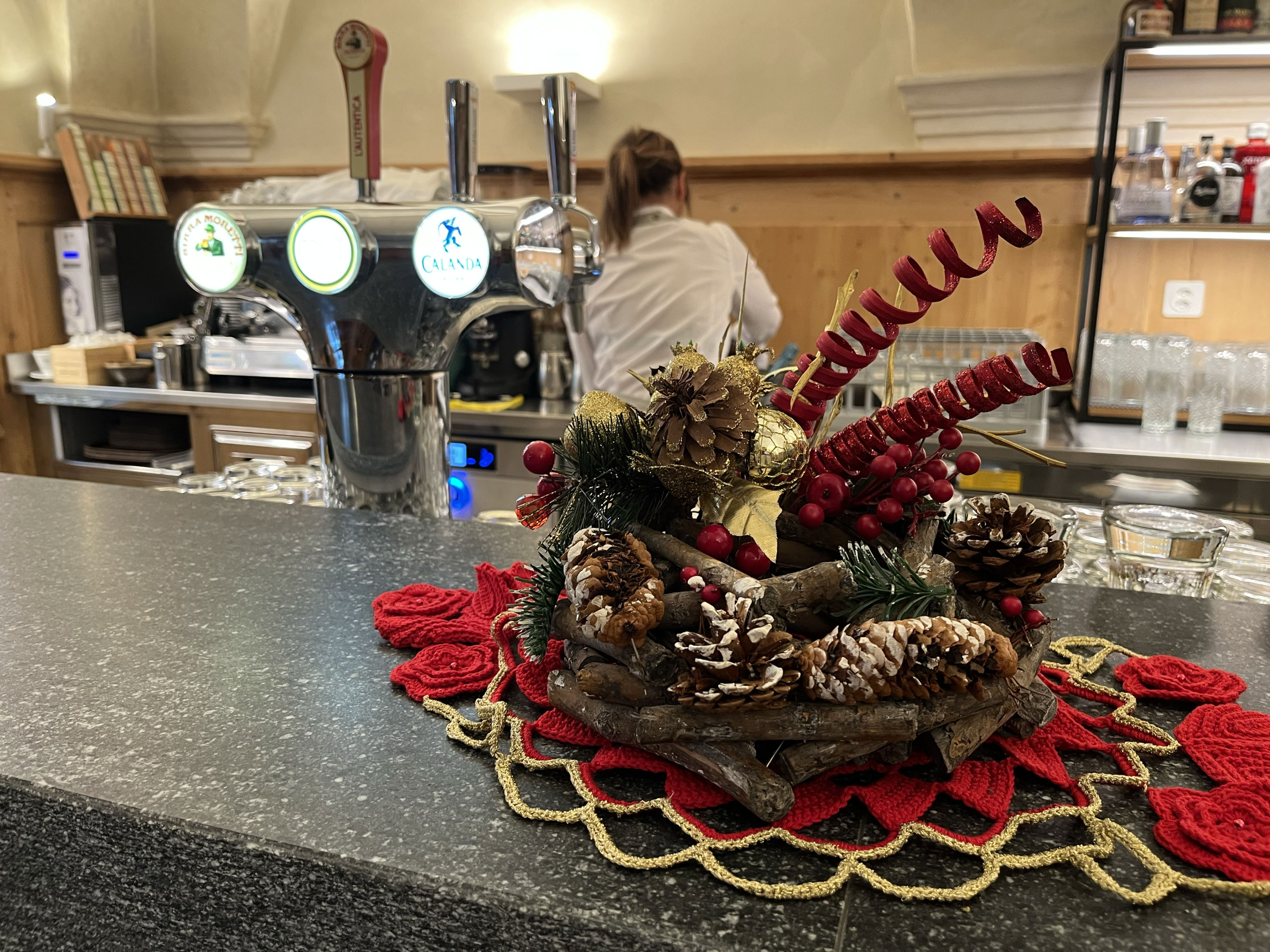 Decorazioni natalizie con pigne e rametti rossi su un tavolo. Sullo sfondo, un bancone bar con una macchina per la birra.