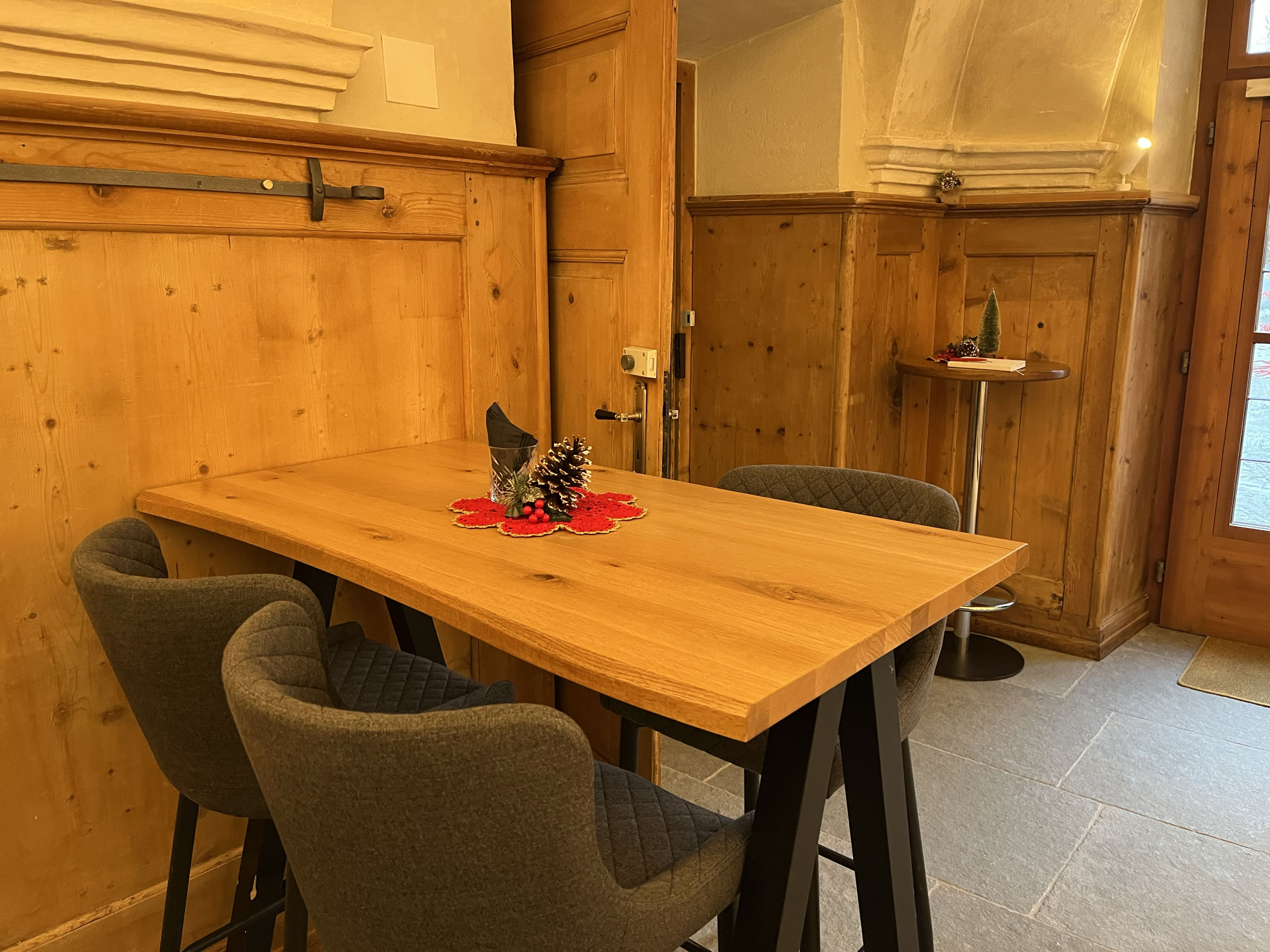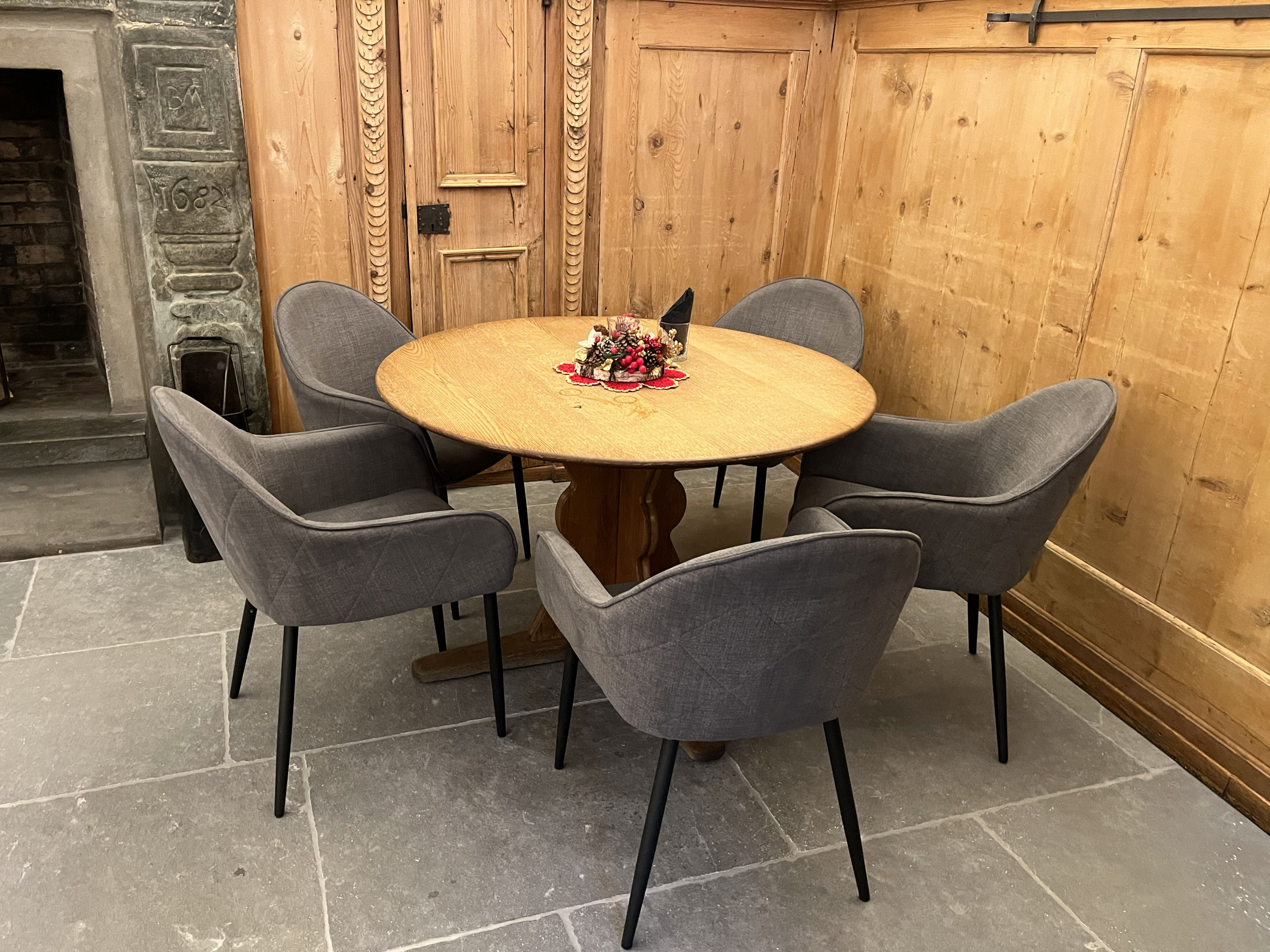 Tavolo rotondo di legno con quattro sedie grigie, situato in un ambiente con pareti in legno e pavimento in pietra. Al centro del tavolo
