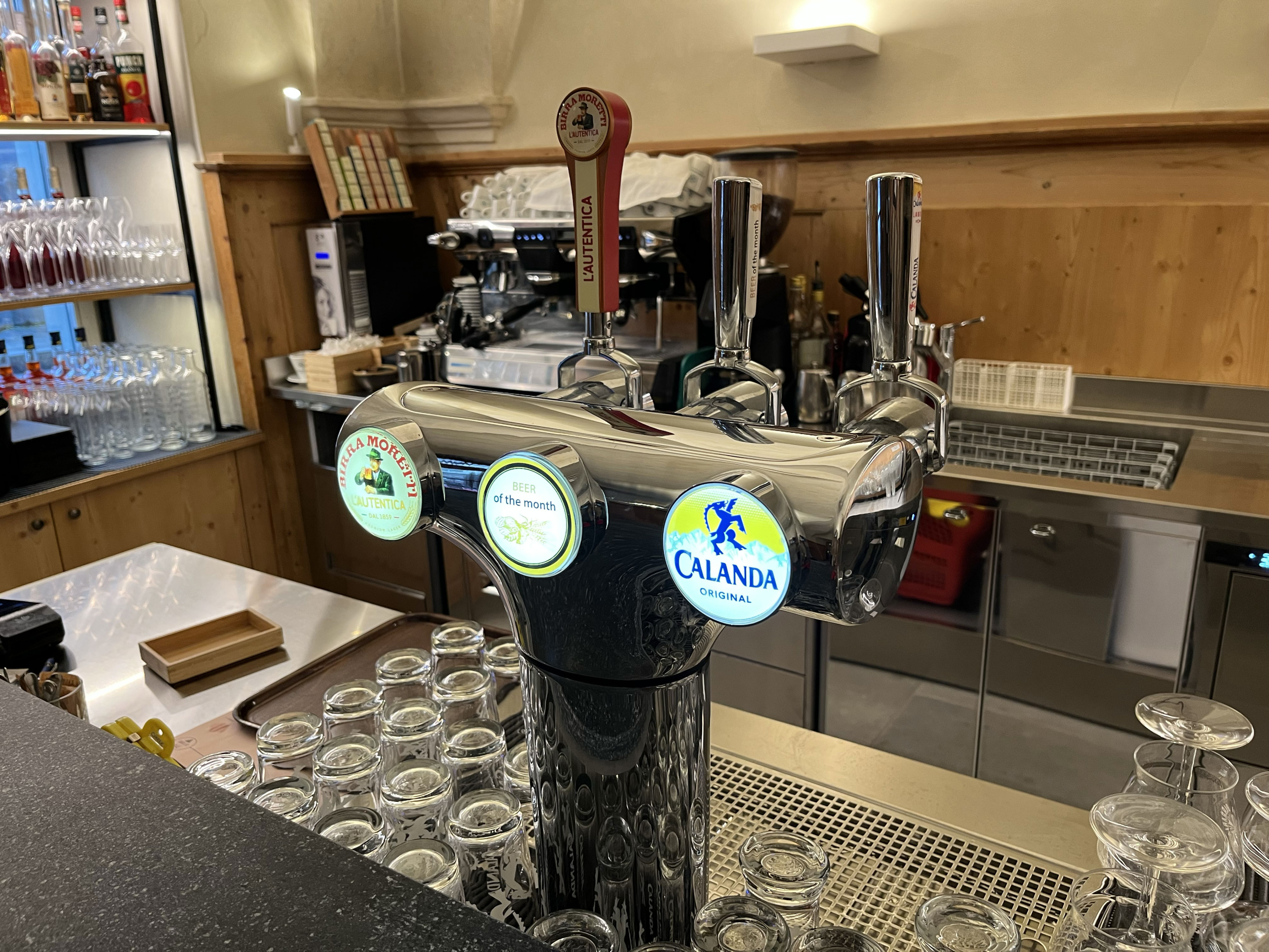 Un bancone bar con un erogatore di birra in acciaio lucido. Ci sono tre rubinetti, due dei quali mostrano i loghi di birre diverse. Sul