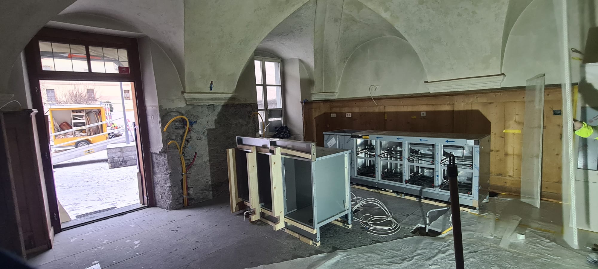 Interno di un edificio con pareti grigie e archi. Un'area in fase di ristrutturazione, con attrezzature e mobili in legno da sistemare. Si
