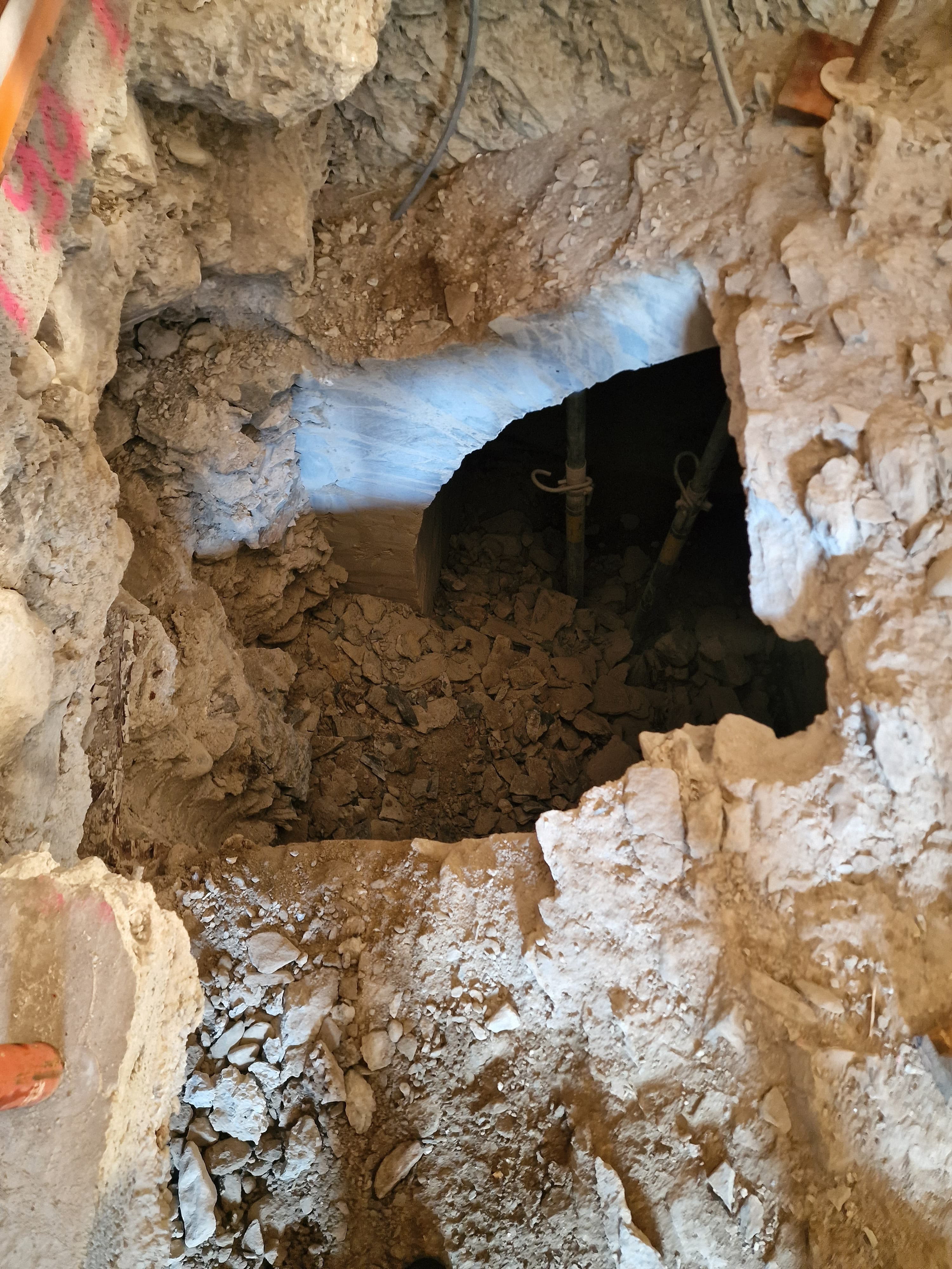Fossa profonda con pareti di roccia e terra, circondata da detriti e tubi di supporto visibili. La luce filtra attraverso un'apertura nella rocc