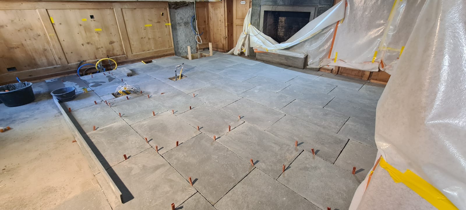 Pavimento in fase di installazione con piastrelle grigie disposte in modo ordinato, supportate da distanziatori. Sullo sfondo, un camino e pareti