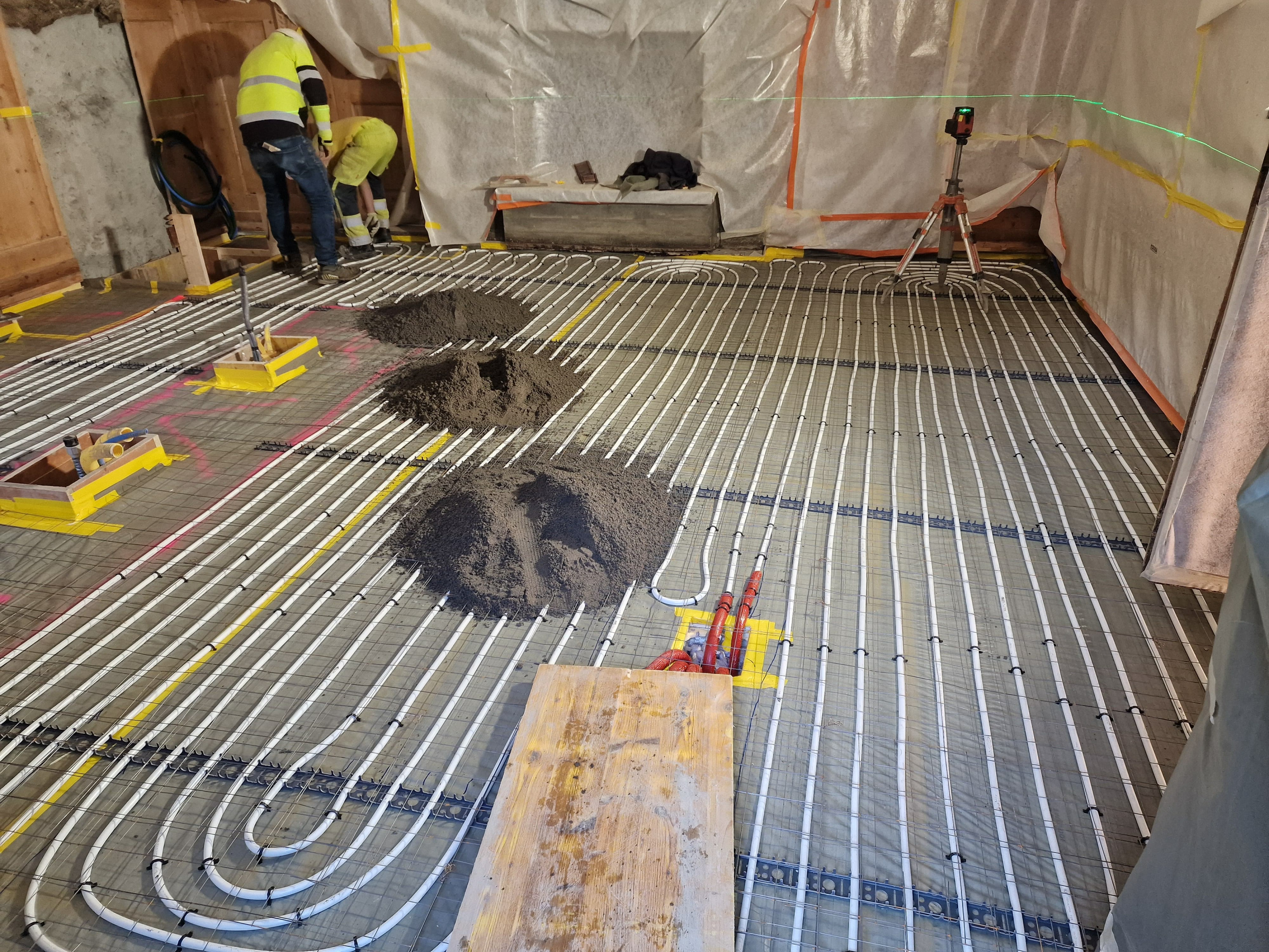 Pavimento di un cantiere con tubi bianchi per riscaldamento a pavimento e cumuli di terra. Due operai in giubbotti riflettenti lavorano sul