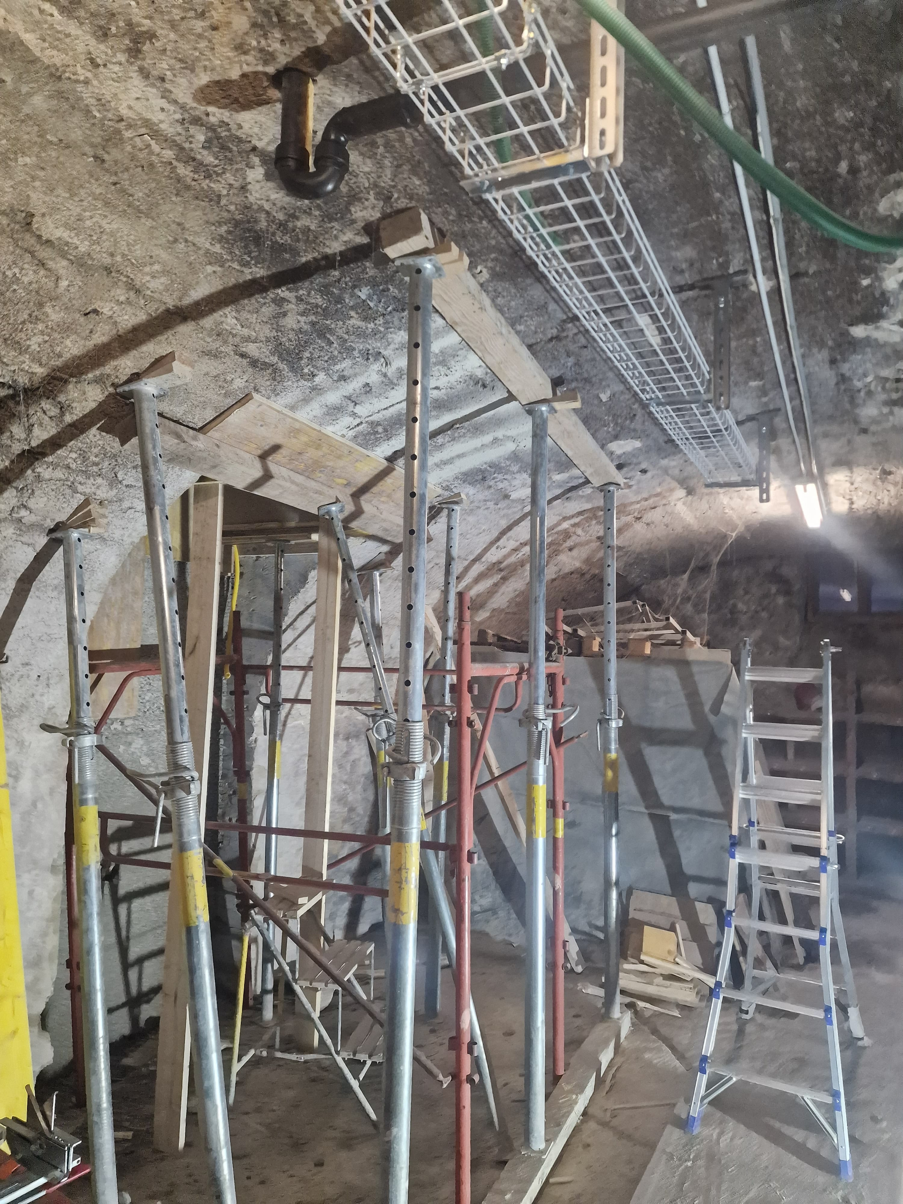 Interno di uno spazio di lavoro sotterraneo con strutture di supporto in metallo, scale e materiali da costruzione. La luce artificiale illumina l'area, evidenziando