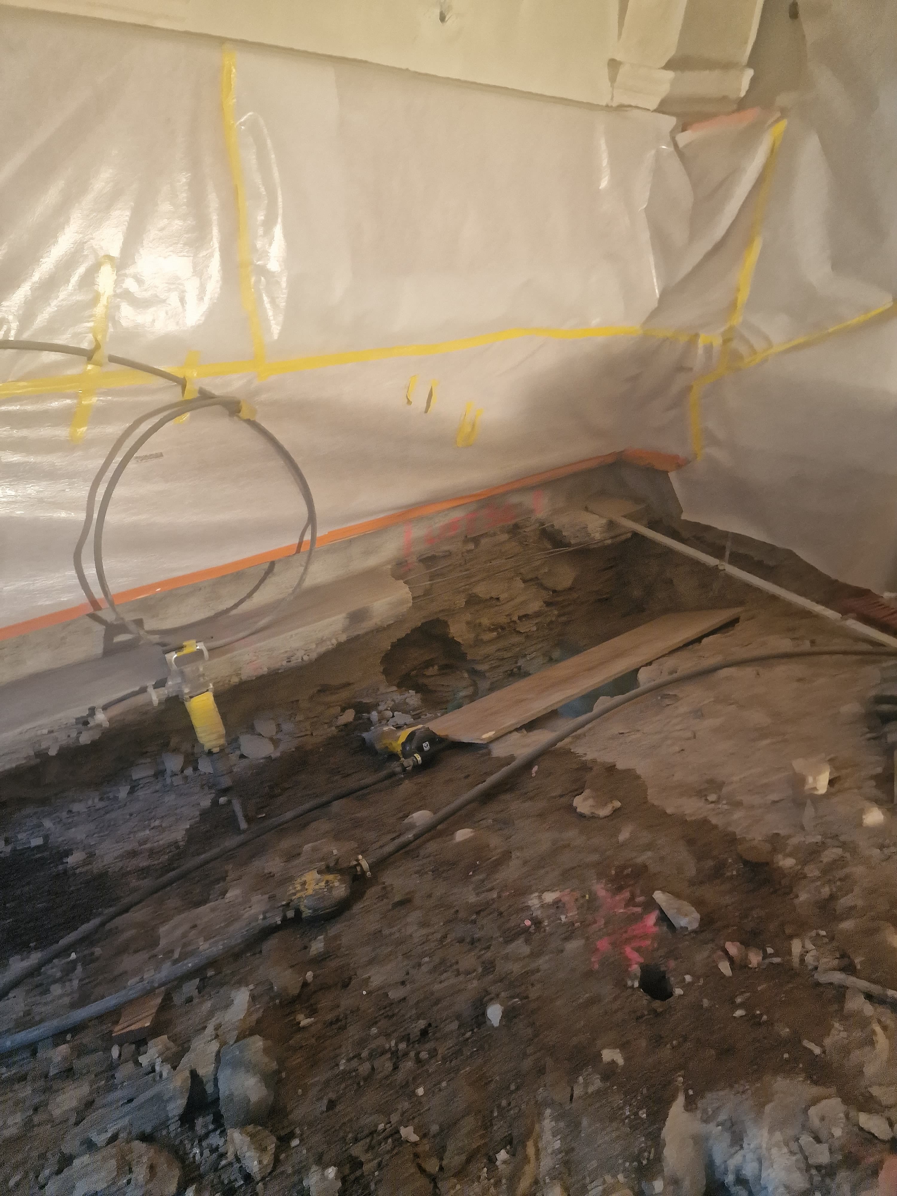 Area di costruzione con pavimento in terra battuta. Fili elettrici e tubazioni sono visibili, insieme a un pezzo di legno posato. Pareti protette da plast