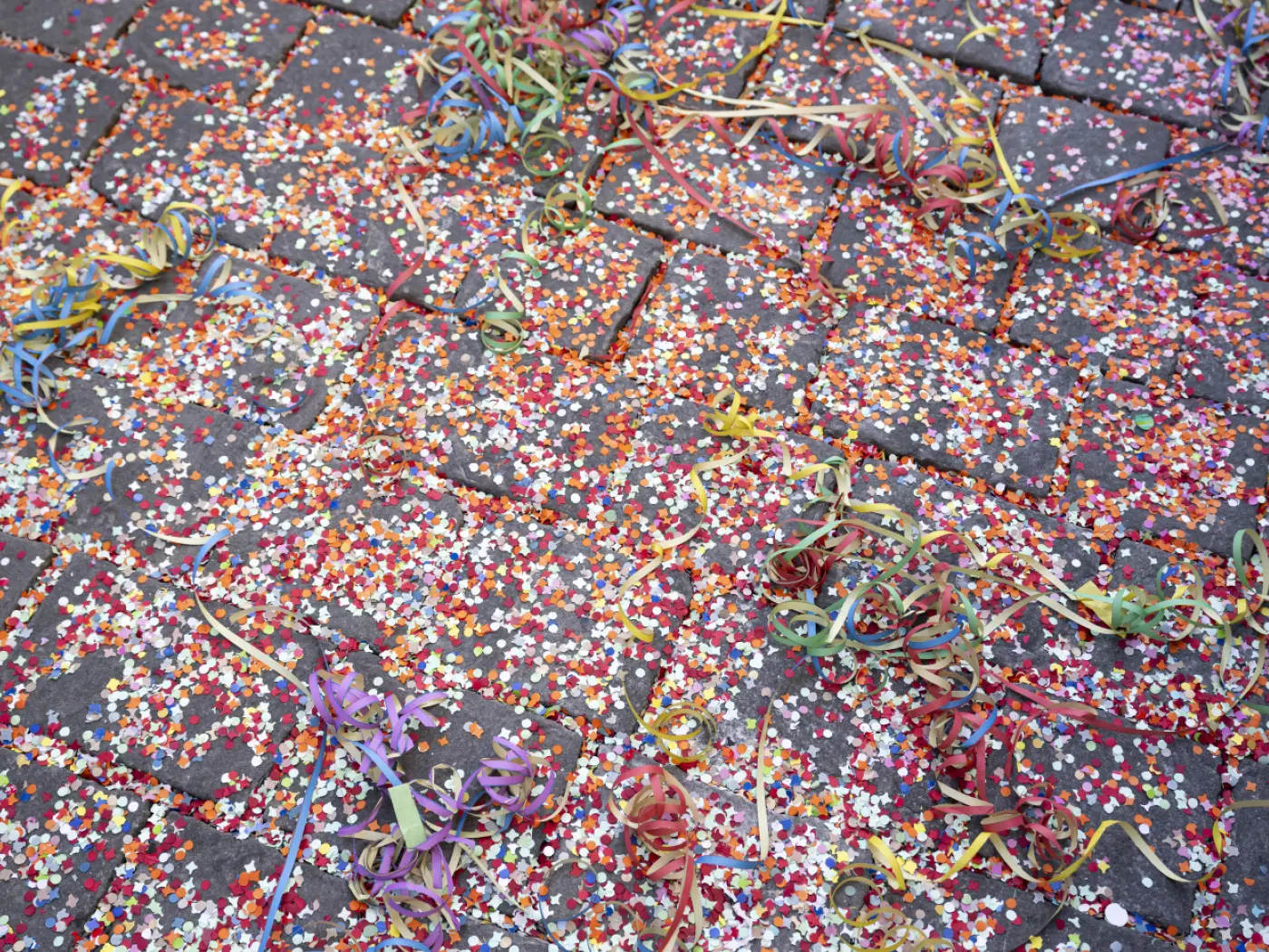 Un pavimento di pietre con festoni e coriandoli colorati sparsi ovunque.