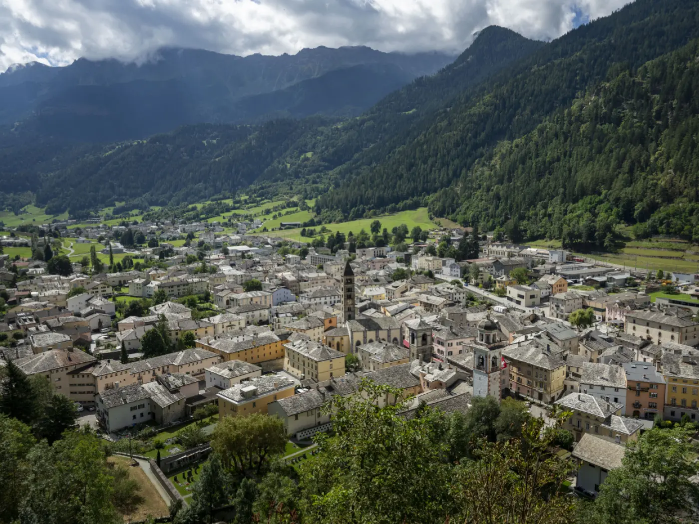 Veduta panoramica di un paese montano con case dai colori tenui, circondato da verdi colline e montagne. Nuvole grigie si stagliano nel cielo.