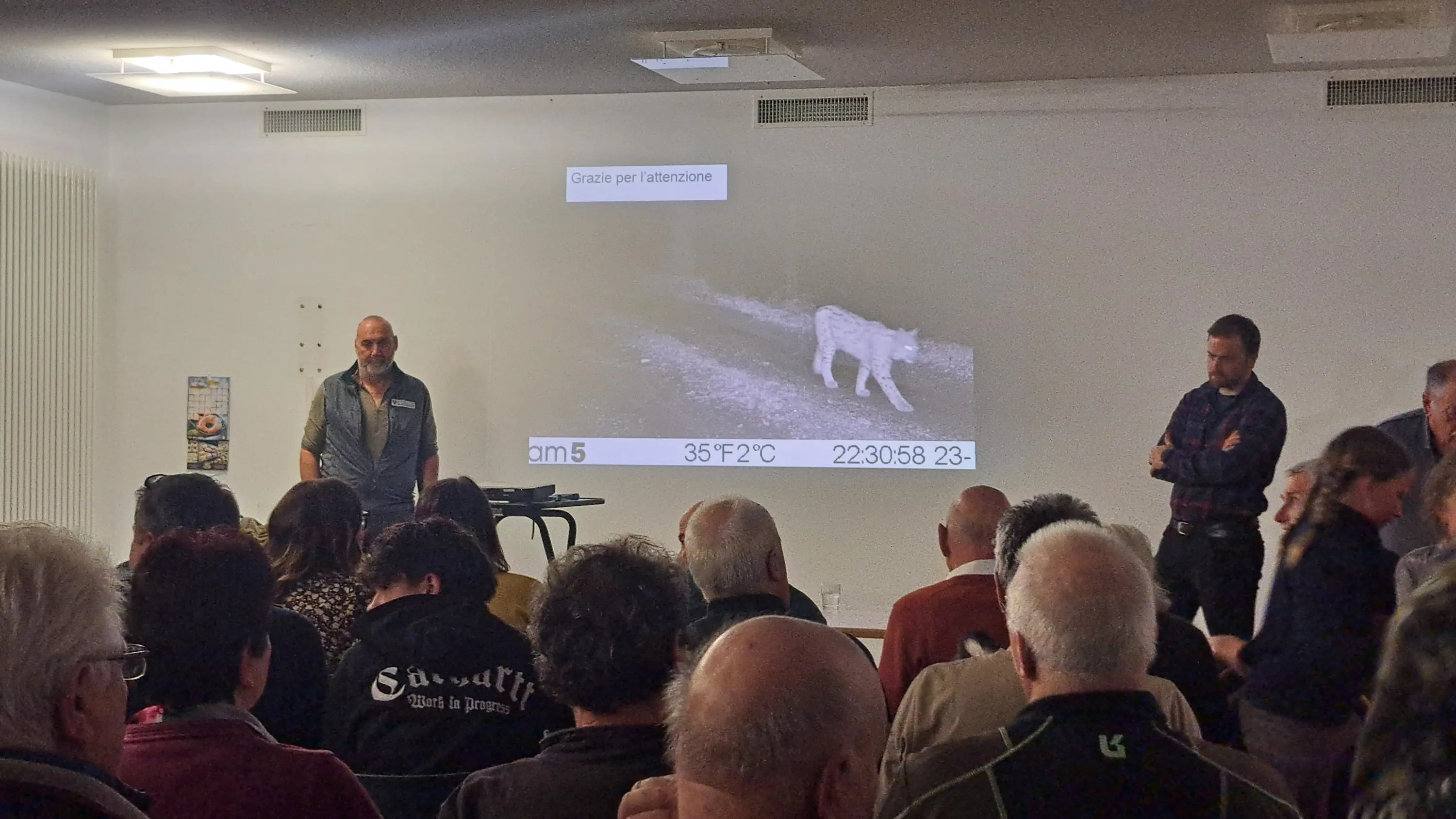 A presentare dapprima l’animale in generale — caratteristiche, comportamento e presenza nel tempo e nel territorio svizzero — è stato Arno Puorger, biologo a capo del Dipartimento “Grandi Predatori” del Canton Grigioni. Insieme a lui, a chiudere la presentazione, il guardiacaccia bregagliotto Renato Roganti, che ha illustrato gli esemplari presenti in Bregaglia, i loro comportamenti e i loro spostamenti.