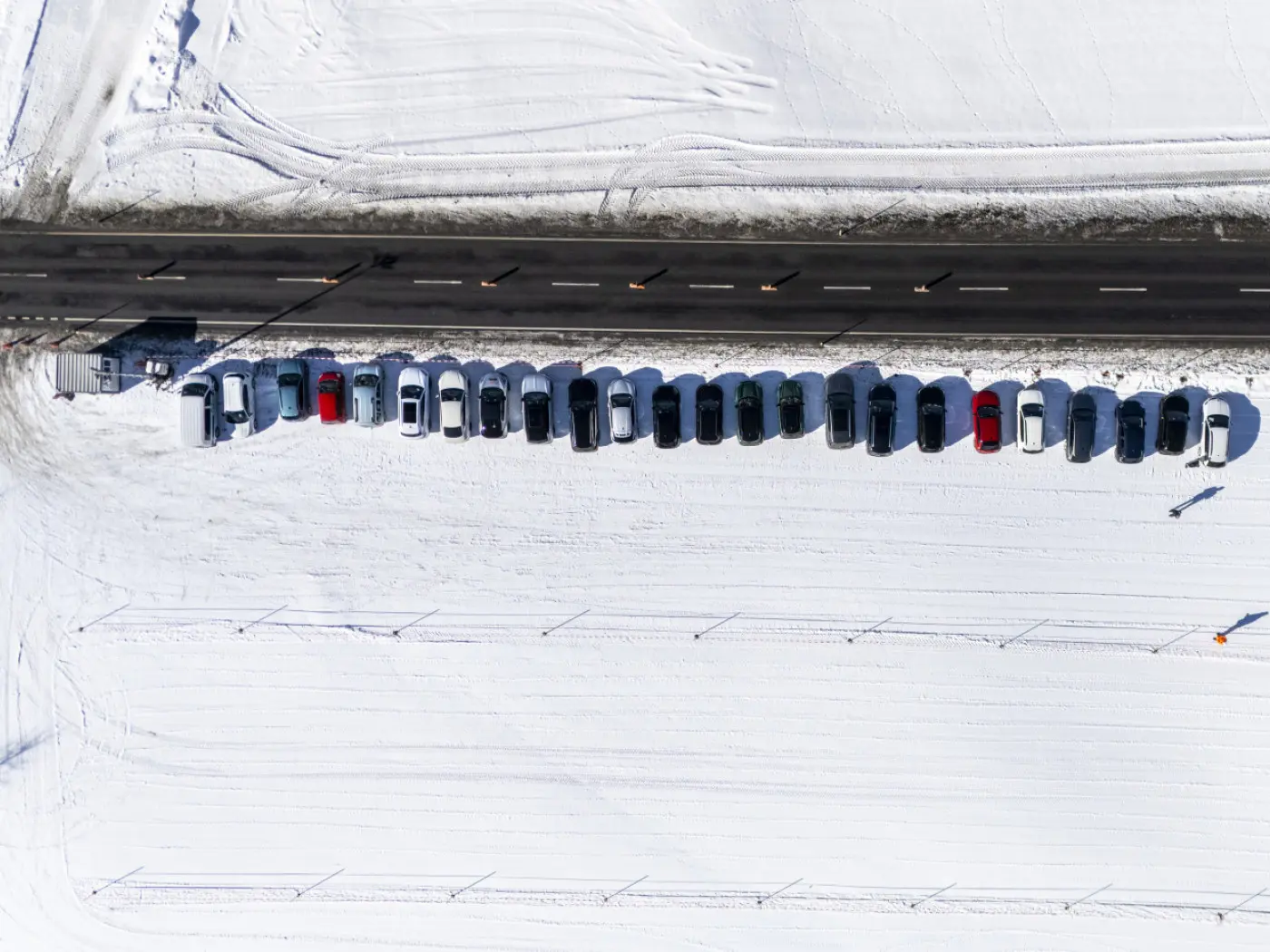 Una fila di automobili parcheggiate su una strada coperta di neve. La vegetazione e il terreno circostante sono bianchi e innevati.