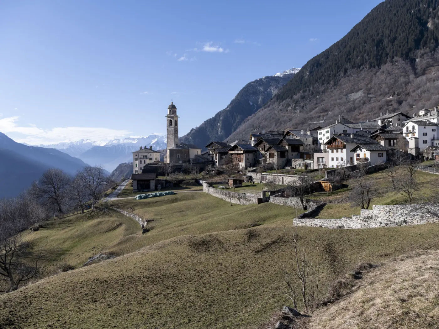 Un paesaggio montano che mostra un villaggio pittoresco con abitazioni in legno e una torre campanaria. Sullo sfondo, si vedono montagne innevate e un