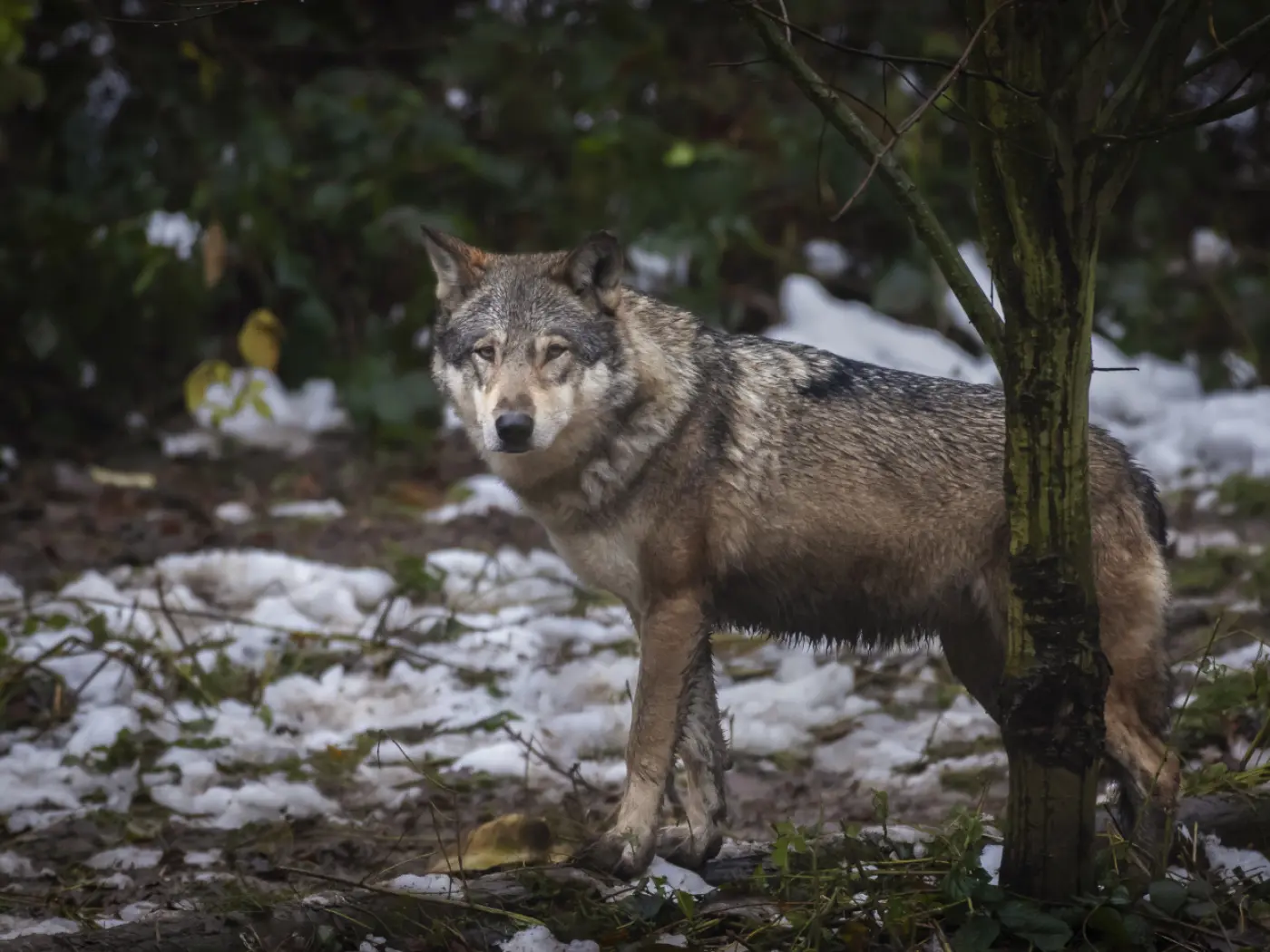 Un lupo si trova in un ambiente boschivo, con la neve sul terreno e vegetazione verde sullo sfondo. Sta guardando verso l'osservatore con una postura attenta