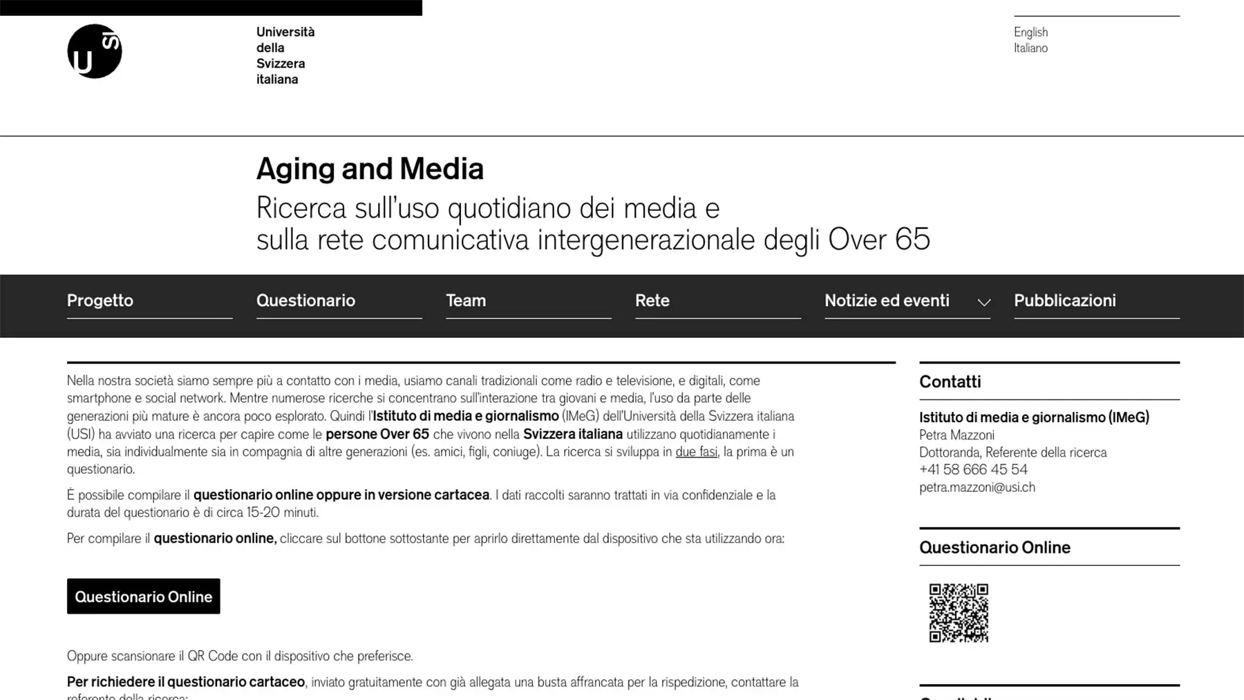Per compilare il questionario online utilizzate il seguente link https://www.agingandmedia.usi.ch e poi cliccare sul pulsante “Questionario Online”.